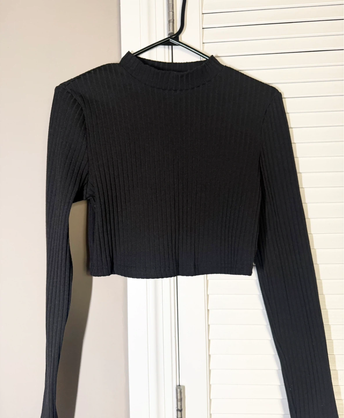 This is a black ribbed long-sleeve cropped shirt. It has a mock neck design. The material is soft and stretchy. Only worn once.