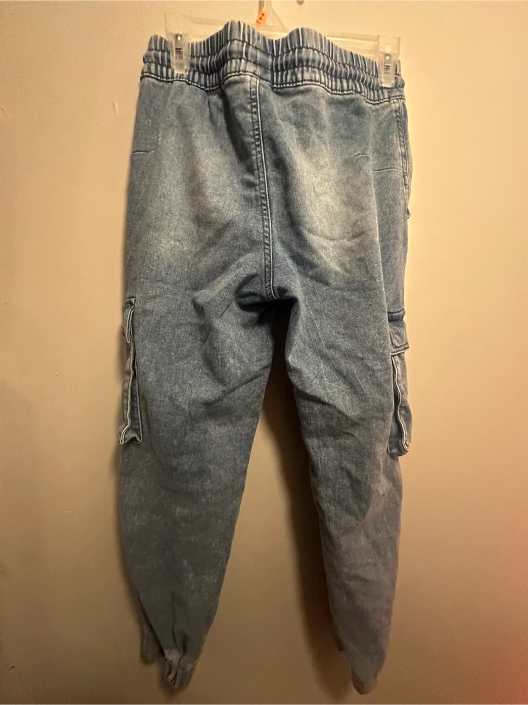These light wash denim cargo jogger pants have a drawstring waist and cuffed ankles. They're made from a soft, flexible denim fabric. These pants are great for casual wear.