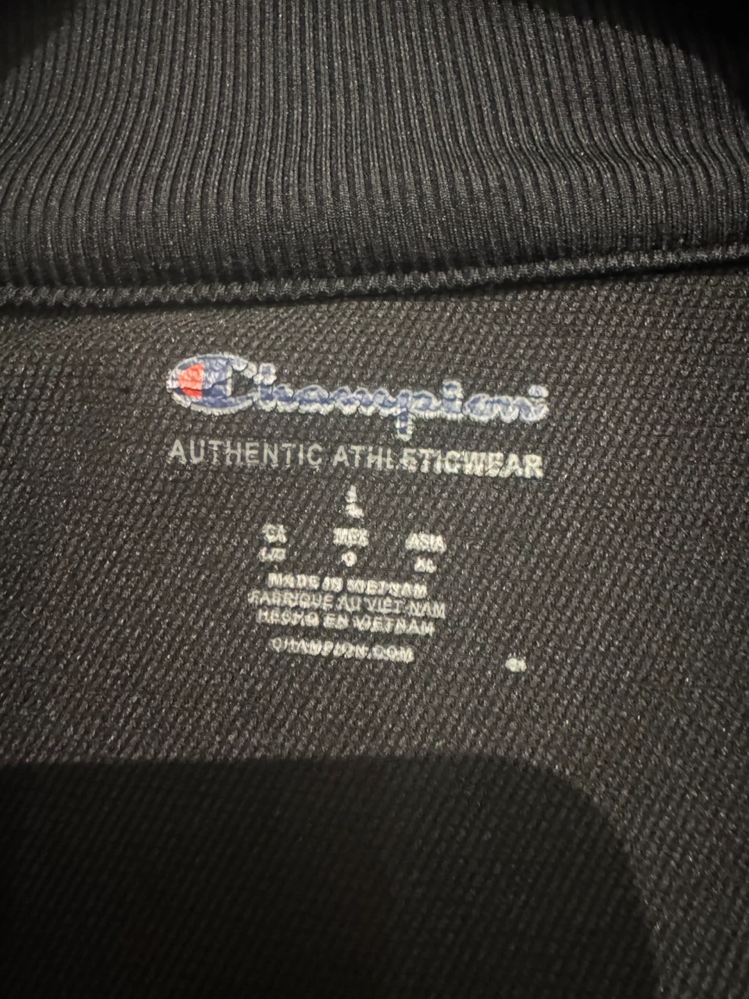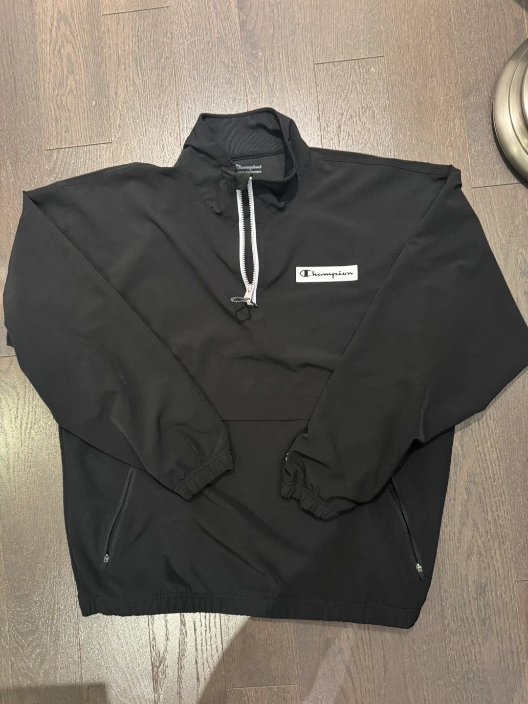 Champion 1/4 zip pullover jacket in black. It's a size large with zippered pockets. Made in Vietnam. This jacket is great for layering on cooler days!