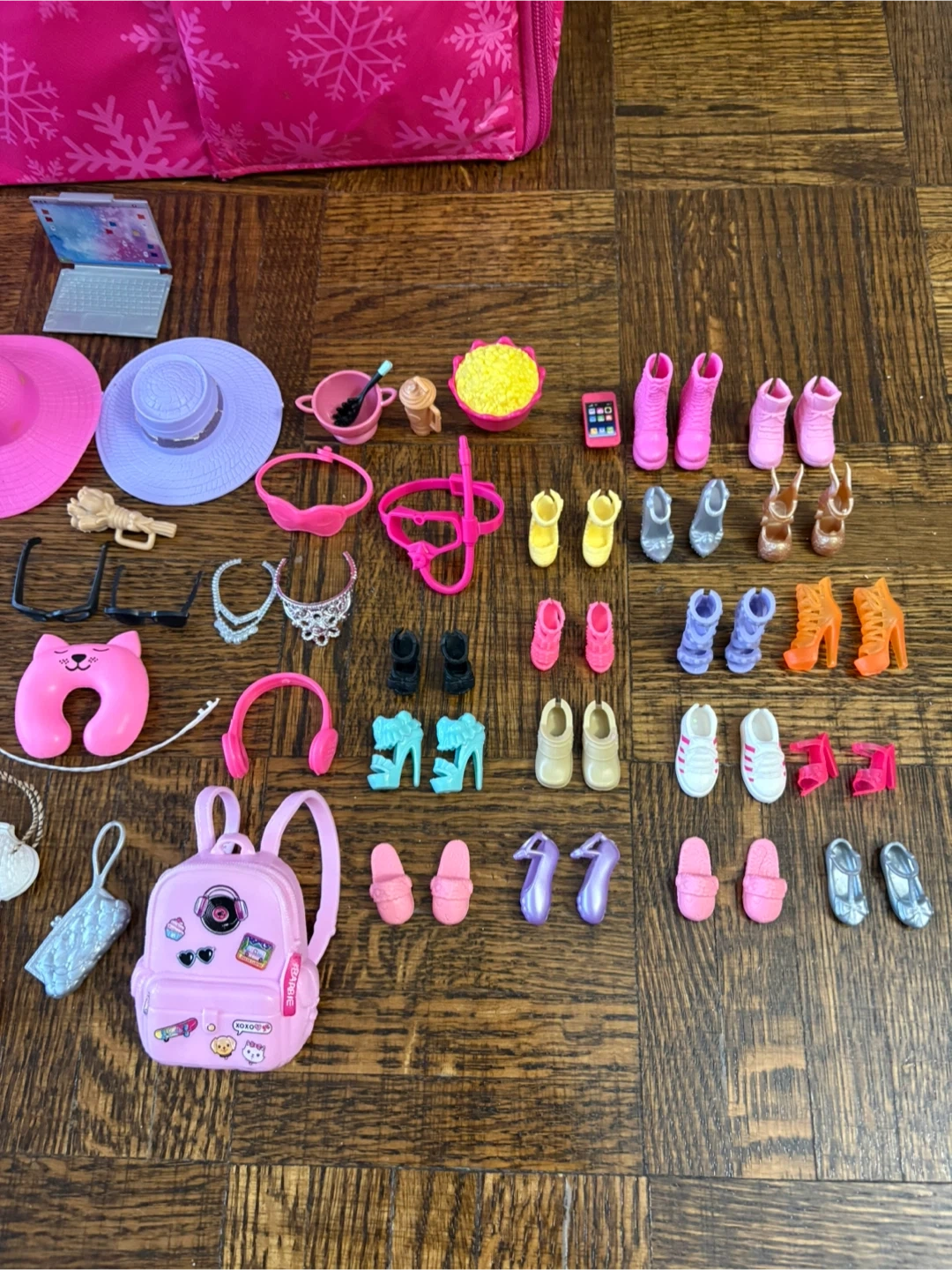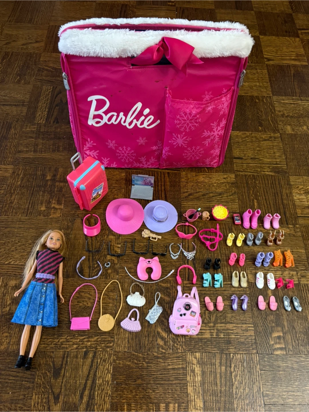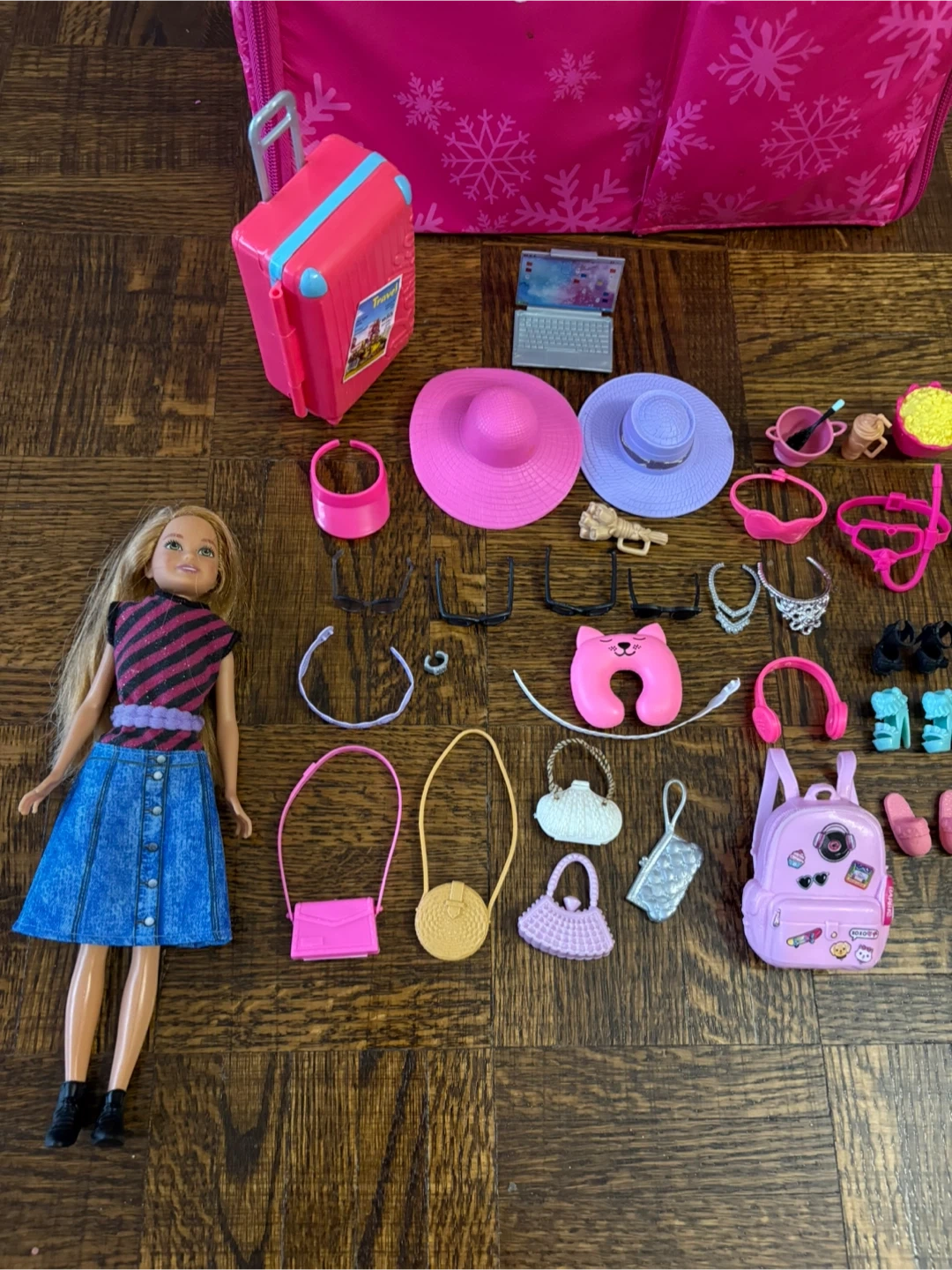This Barbie set includes a doll, a pink suitcase, a large pink travel bag, and numerous travel-themed accessories. It comes with hats, shoes, handbags, a laptop, and more.