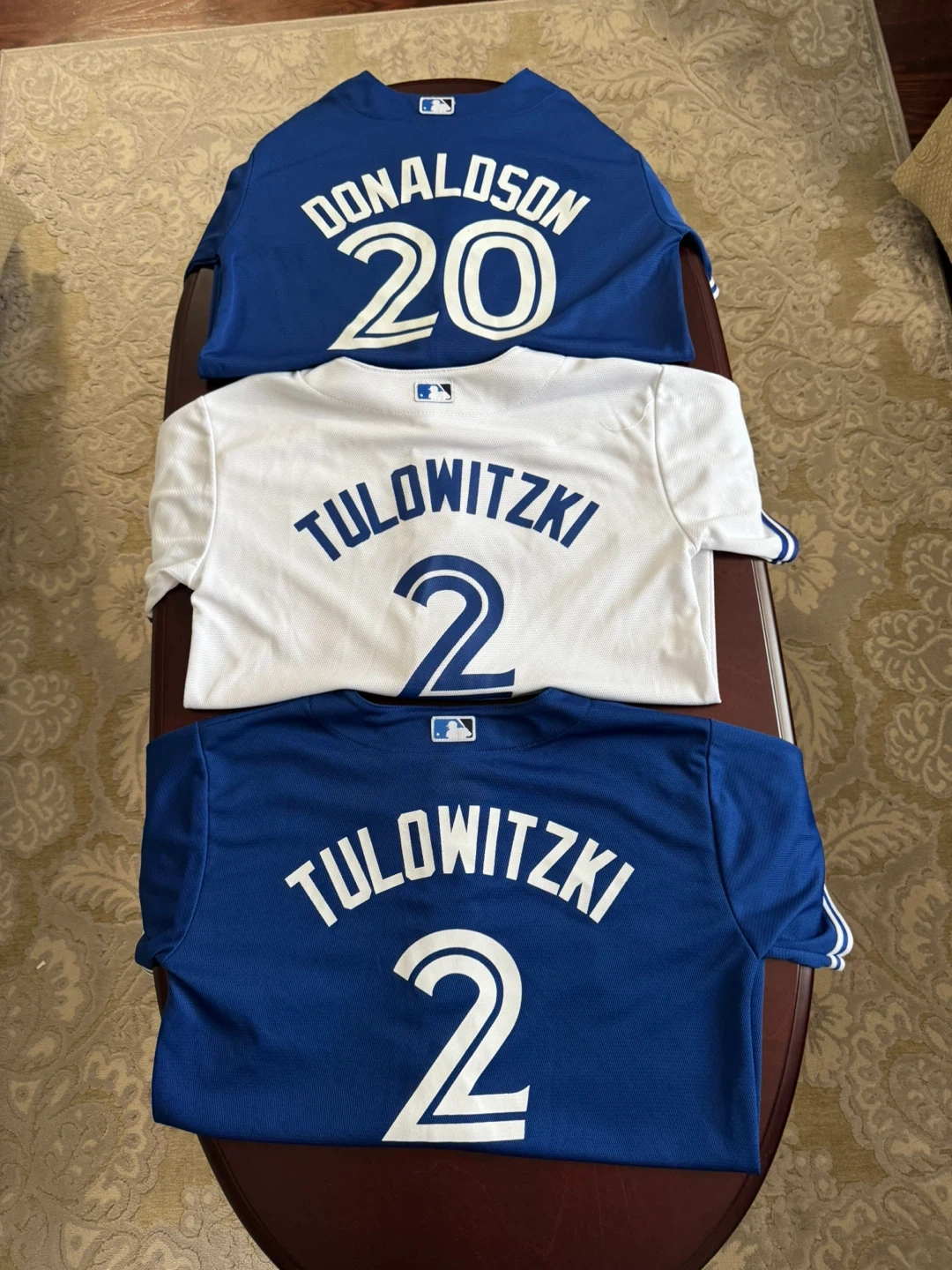 Official Blue Jays jerseys. Donaldson and Tulowitzki. All in excellent condition. All size youth large (14/16). $60 each or all three for $150.