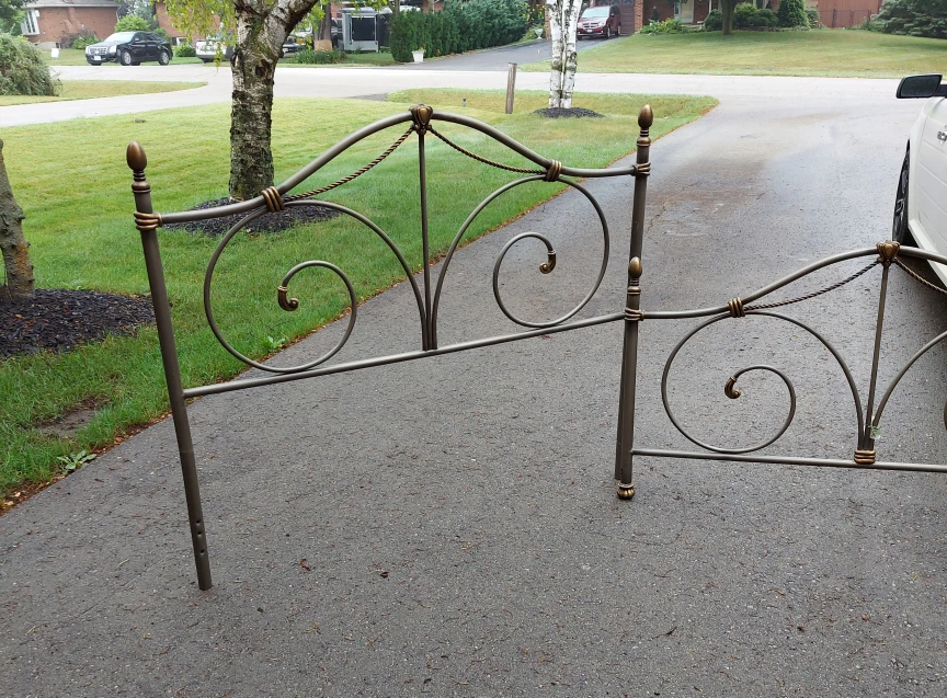 This is a metal headboard and footboard set with a decorative scroll design. It's a bronze-like colour with gold accents. Easy to assemble onto your bed frame. Suitable for a queen or double bed.