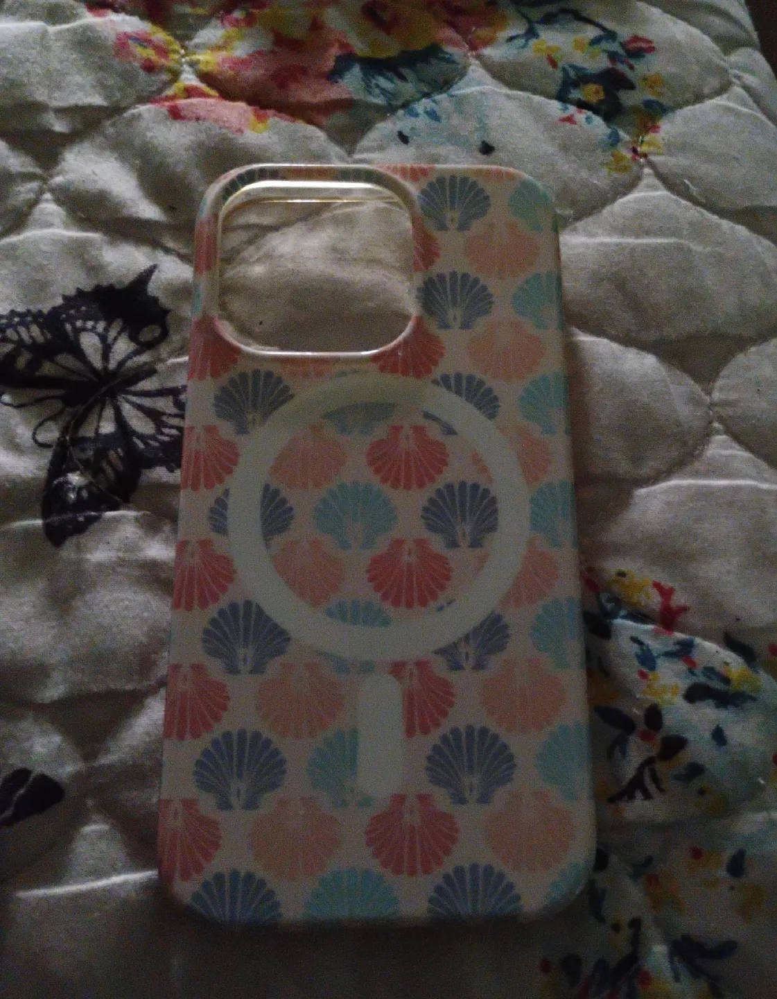 This phone case has a cute seashell pattern in shades of pink and blue. It also features a MagSafe ring for easy wireless charging!