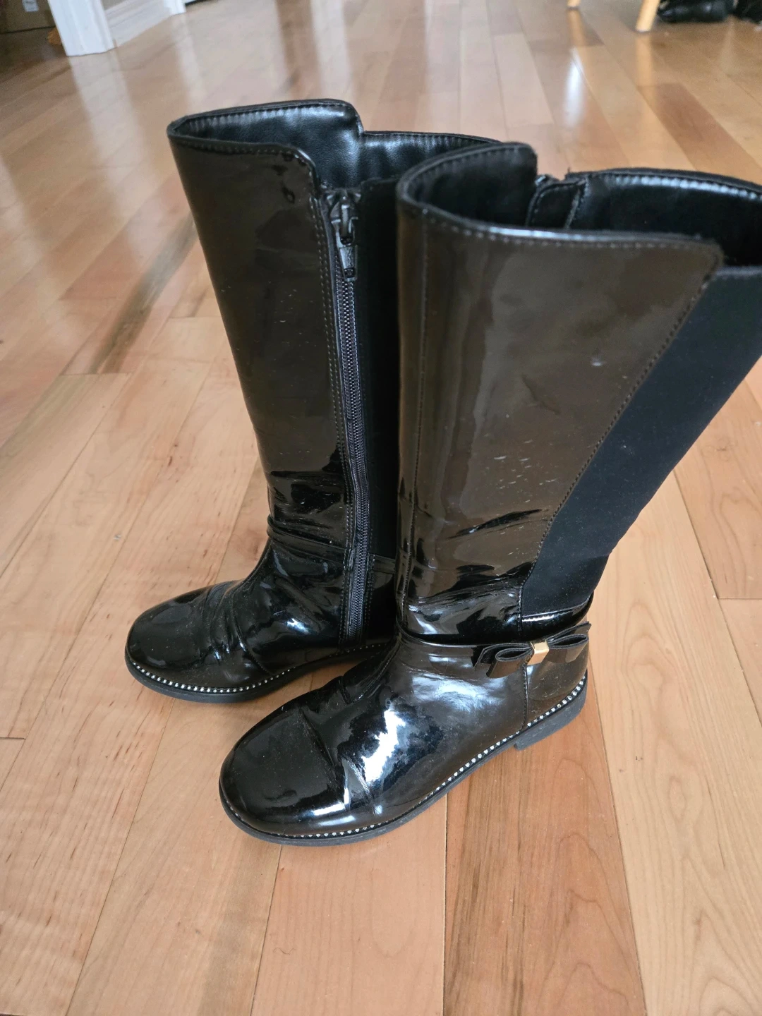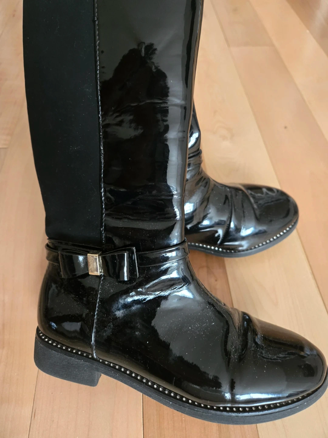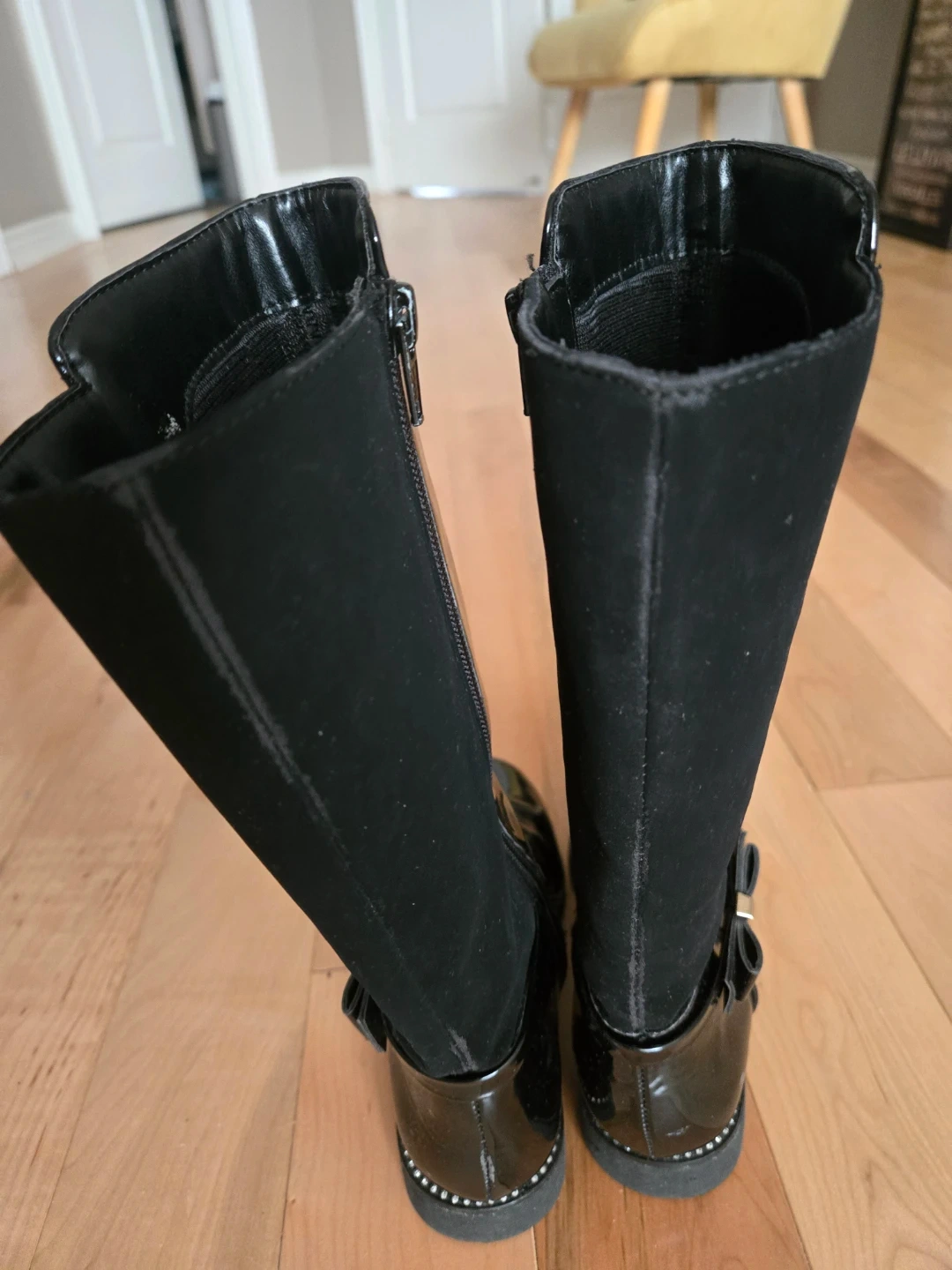 These black boots feature a shiny patent leather finish combined with a soft suede shaft. They have side zippers for easy on and off. A buckle detail at the ankle adds a stylish touch. These boots are great for dressing up an outfit!