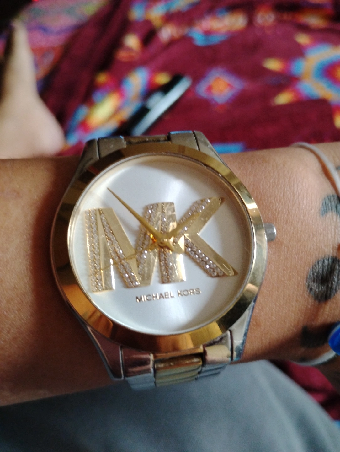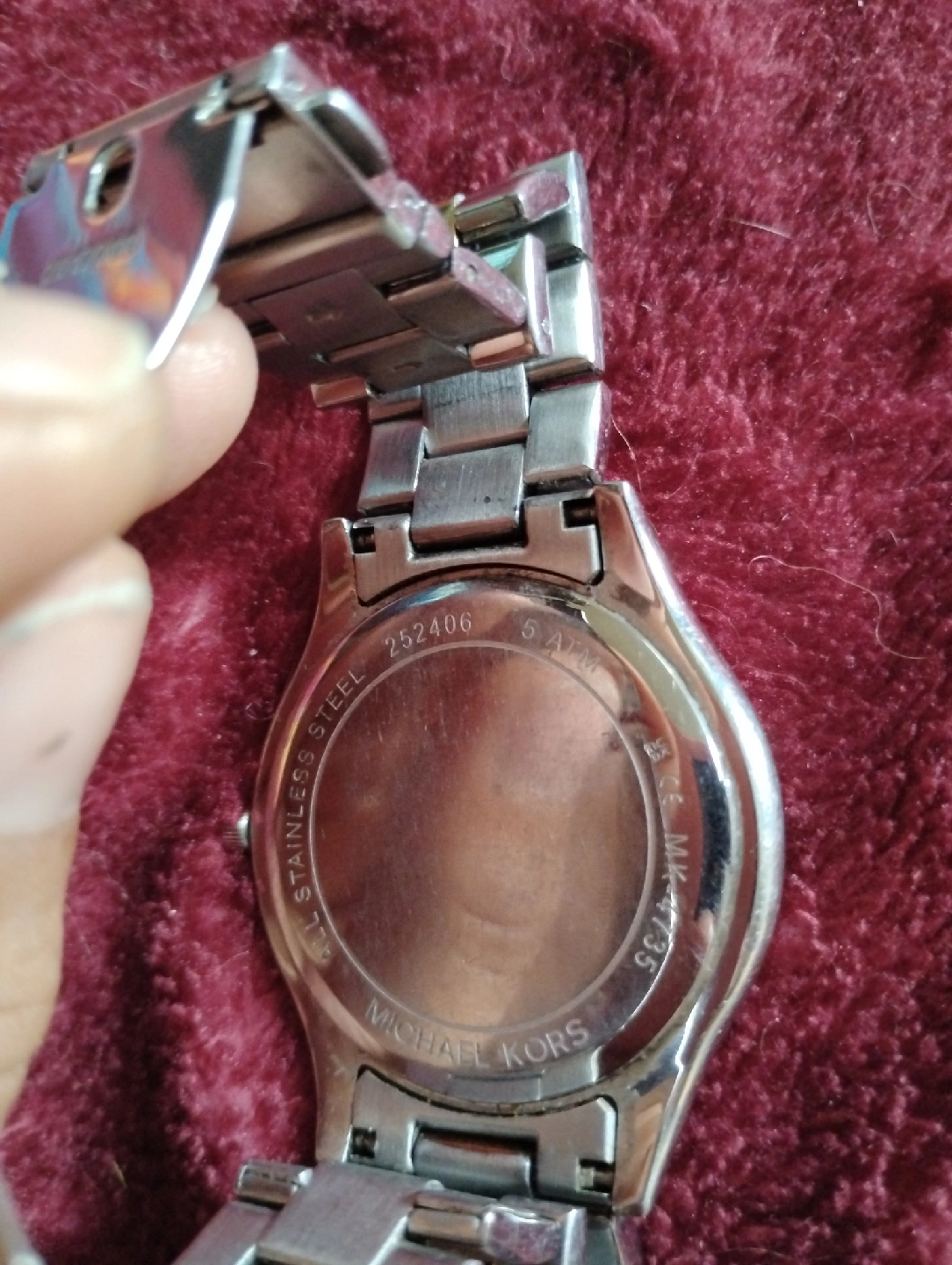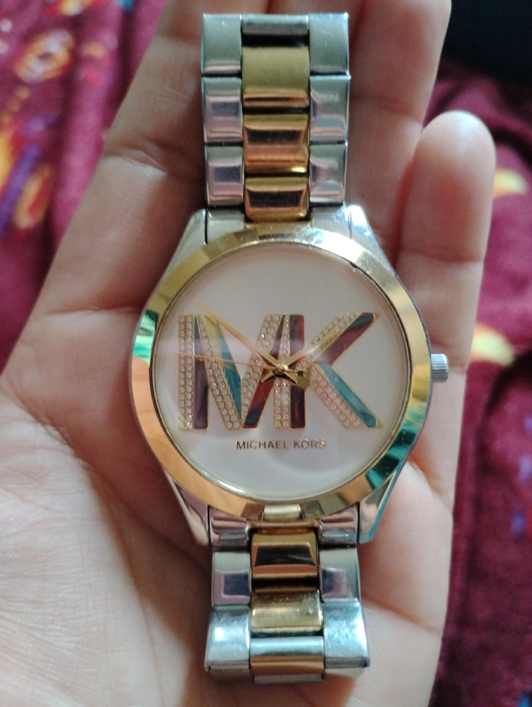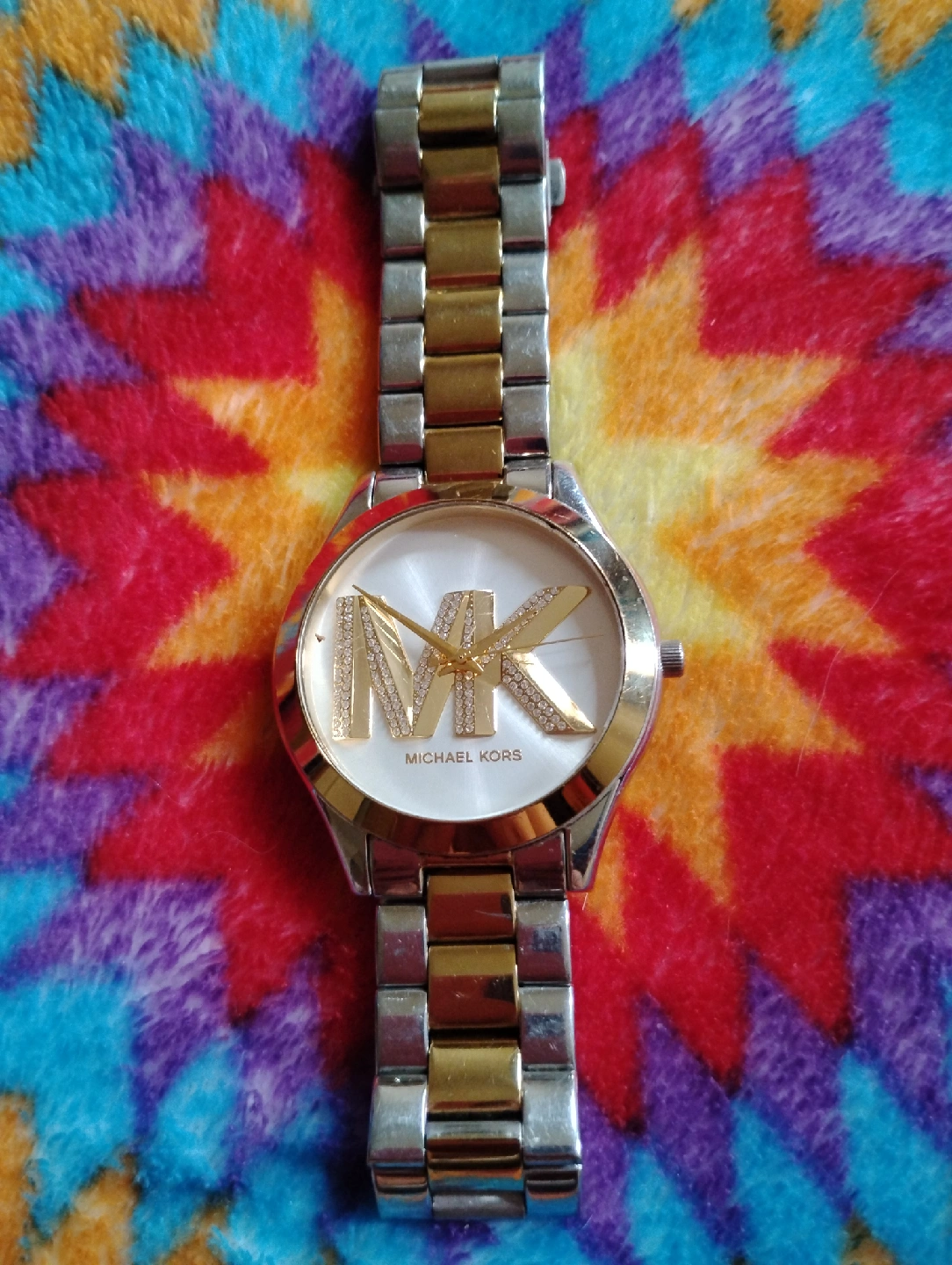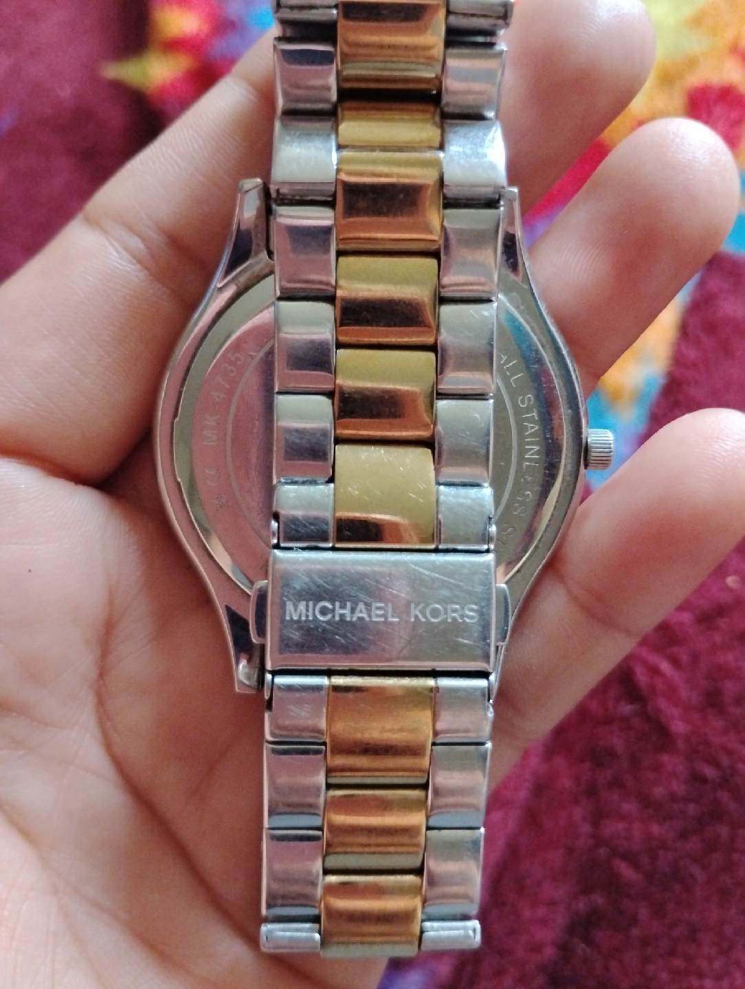 Selling a Michael Kors ladies watch, model MK-4735. It features a stainless steel and gold-tone band with the MK logo on the face. The back of the watch is also stainless steel and marked with 'ALL STAINLESS STEEL' and 'MICHAEL KORS'.