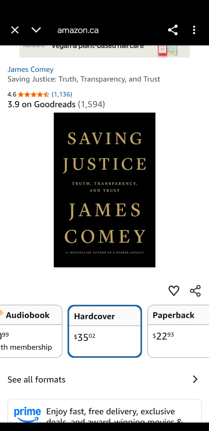 Selling a hardcover copy of "Saving Justice: Truth, Transparency, and Trust" by James Comey