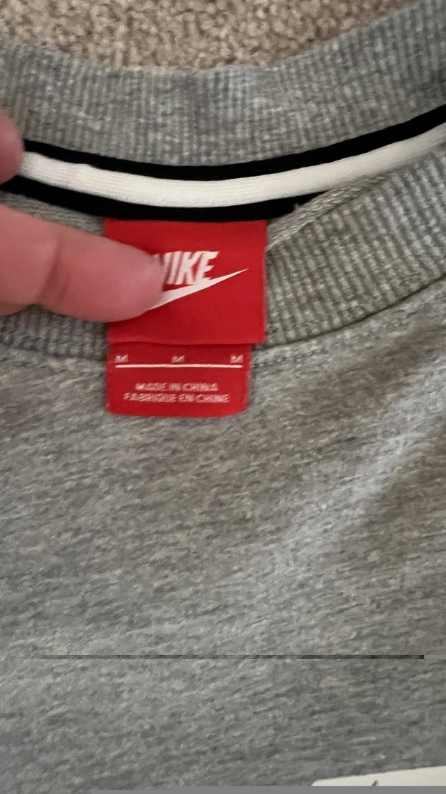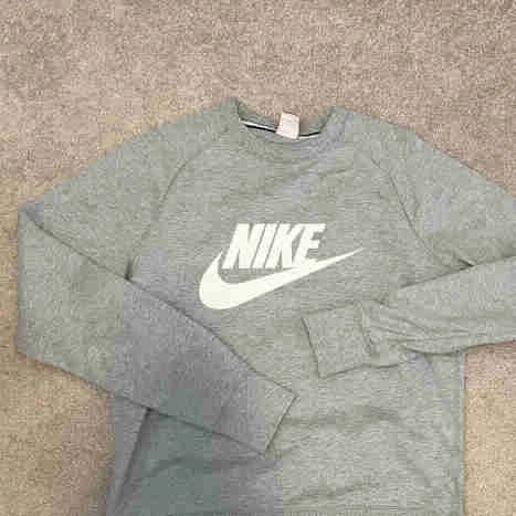 This is a grey Nike sweatshirt with a white logo in a women's size medium and in good condition. Additional details include: