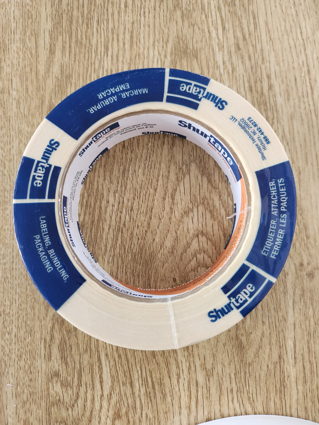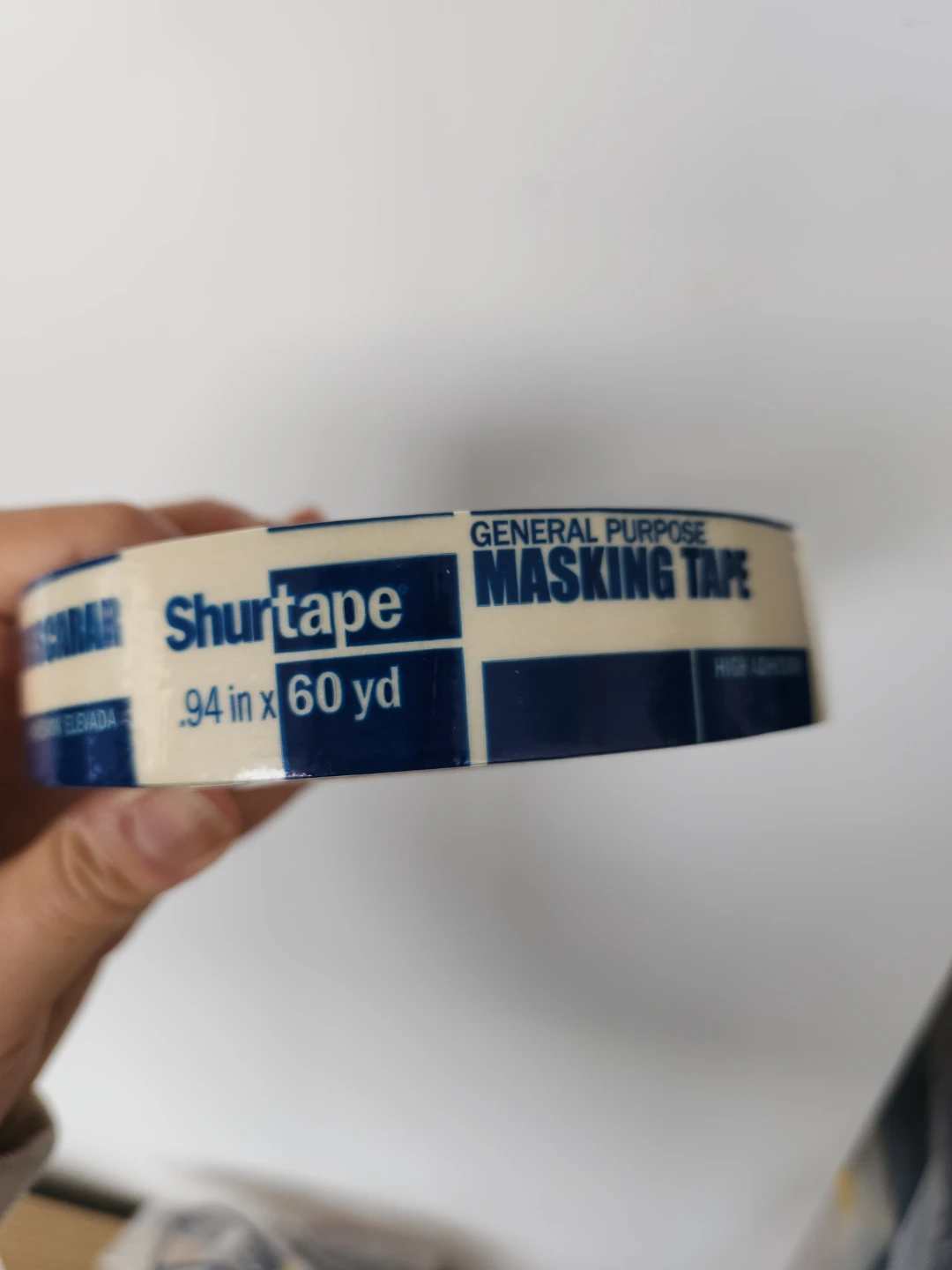 Shurtape general purpose masking tape. It's 0.94 inches wide and 60 yards long.