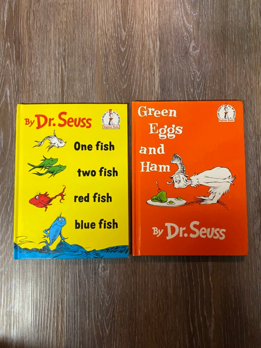 Two classic Dr. Seuss Beginner Books. Includes "One Fish Two Fish Red Fish Blue Fish" and "Green Eggs and Ham". Both are