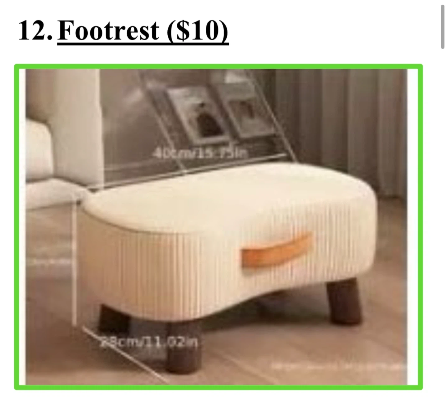 Selling a footrest ottoman in great condition! It measures approximately 40cm/15.75 inches in length and 28cm/11.02 inches in height. Perfect for adding a touch of comfort and style to your living space