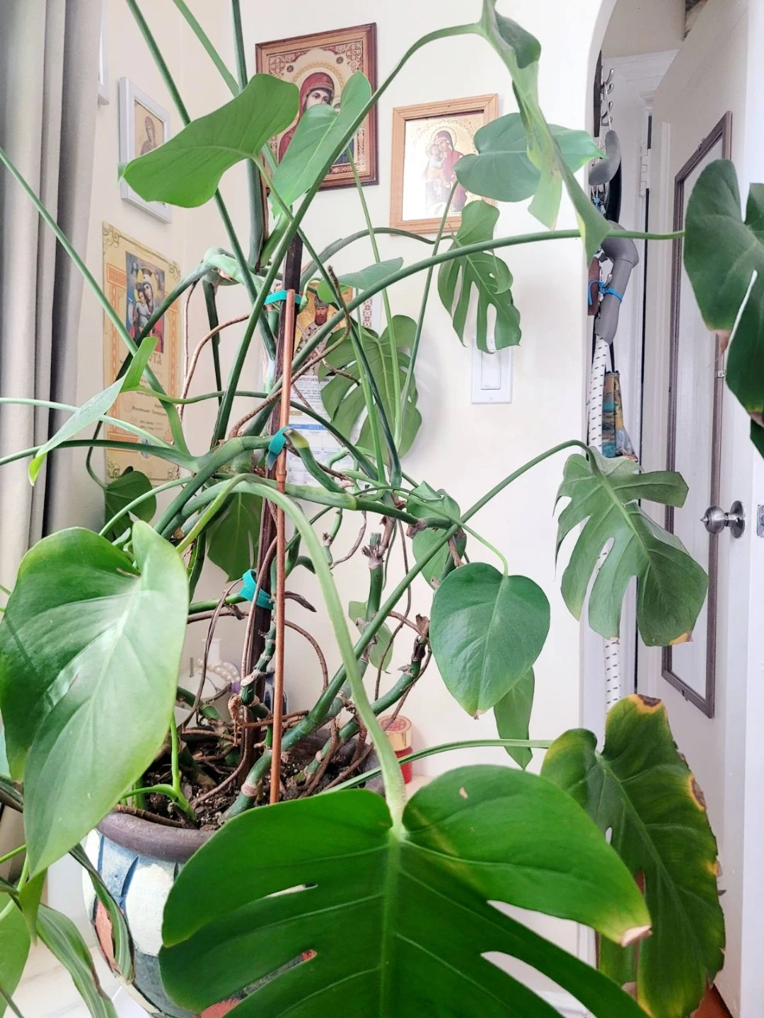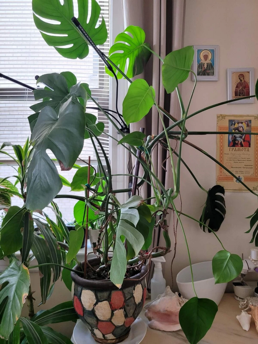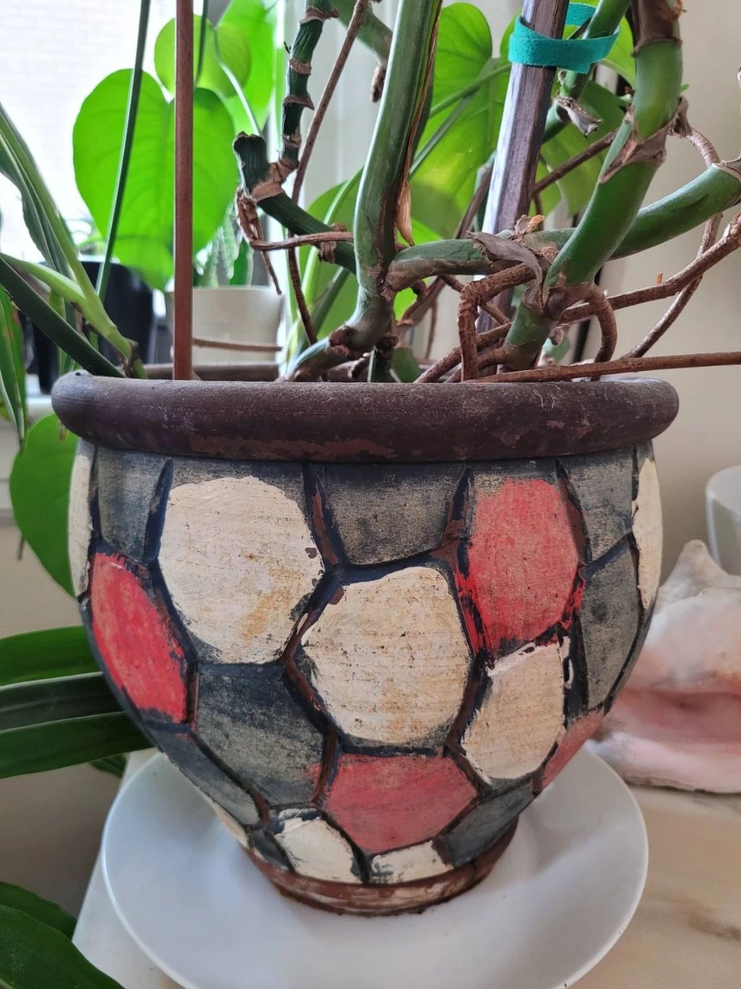 This is a large Monstera Deliciosa plant. It's in a decorative ceramic pot with a mosaic pattern. The plant has several large, split leaves and is actively growing. It's great for adding a tropical feel to any indoor space!