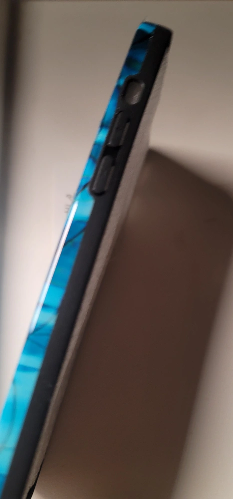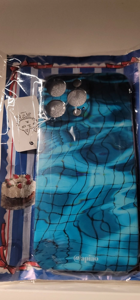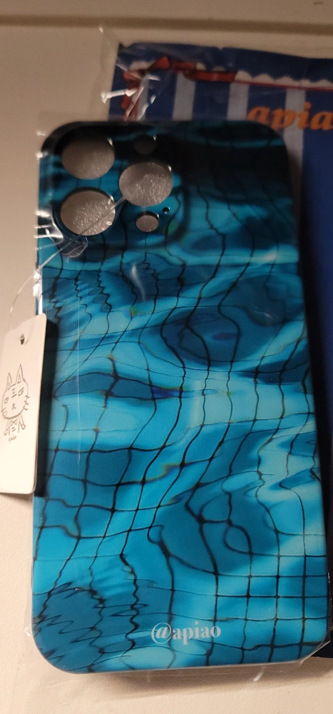 This is a brand new iPhone 13 Pro Max case. It has a blue and white ripple pattern with a black border around the edge. It has cutouts for the camera and side buttons. It is made of a hard plastic material.
