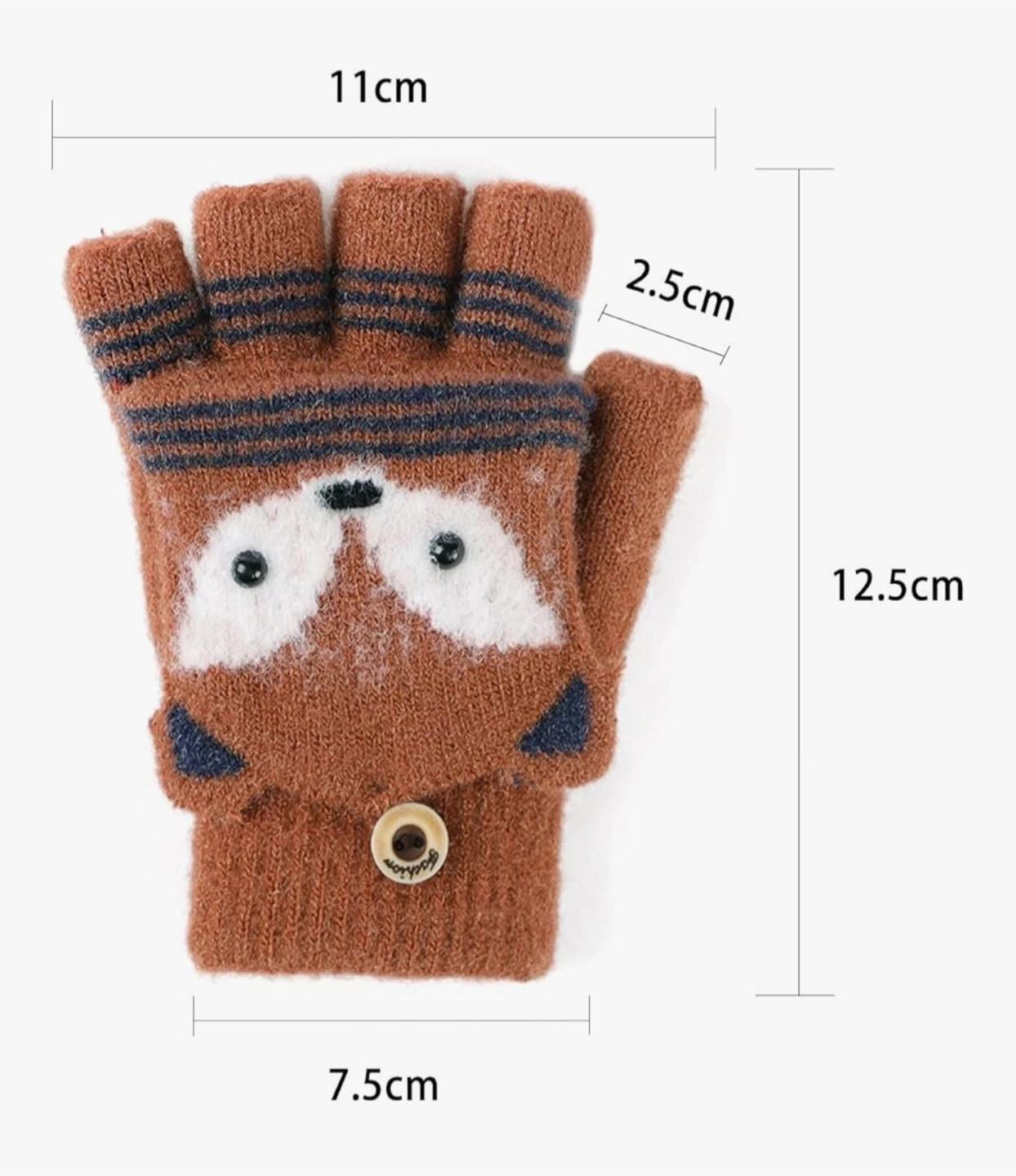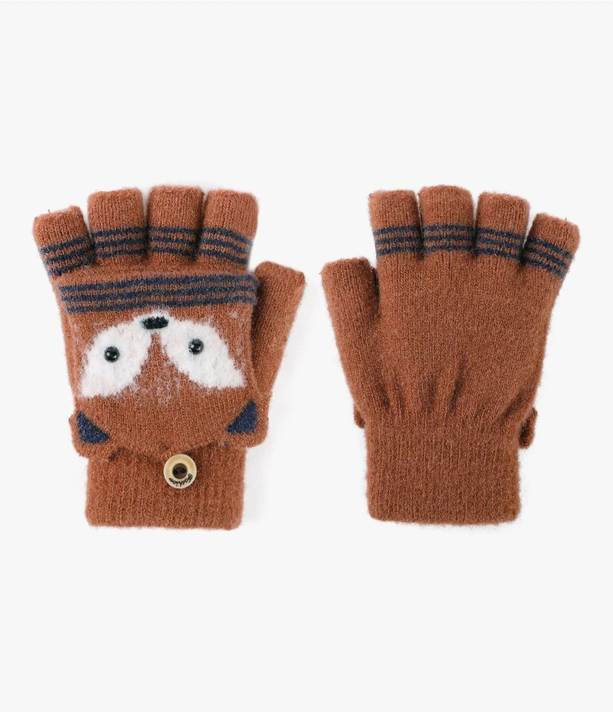 Cute brown mittens with a flip-top design, featuring a fox face. These gloves have a cozy feel and are perfect for keeping little hands warm.