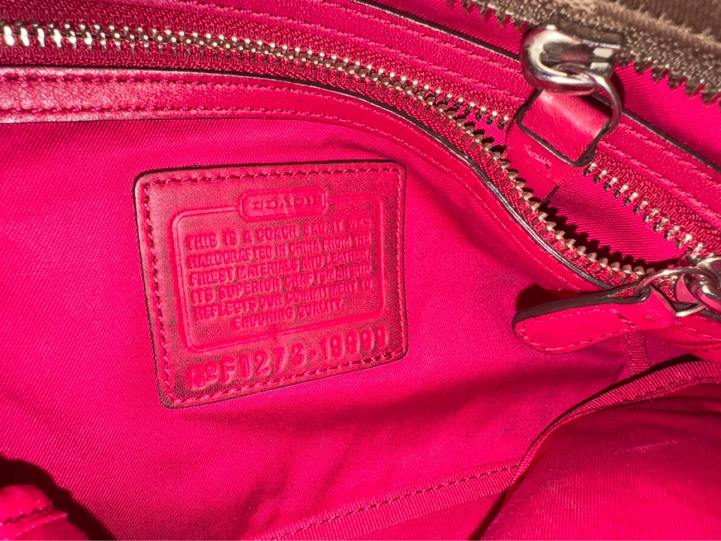 Authentic Coach tote bag with signature monogram print and pink stripe detail. Interior is a vibrant pink with multiple pockets. Leather trim and handles. Includes original Coach hang tags.