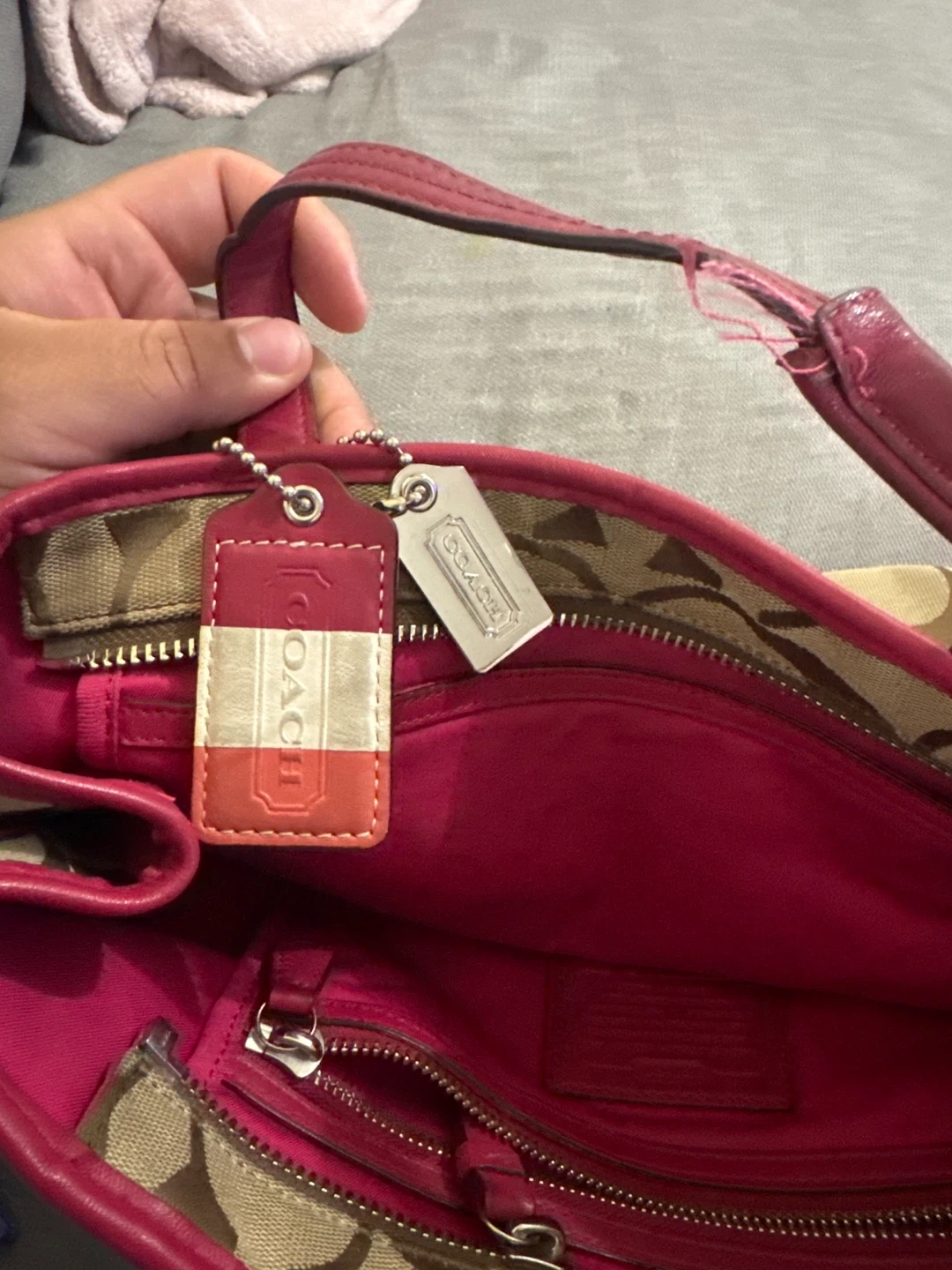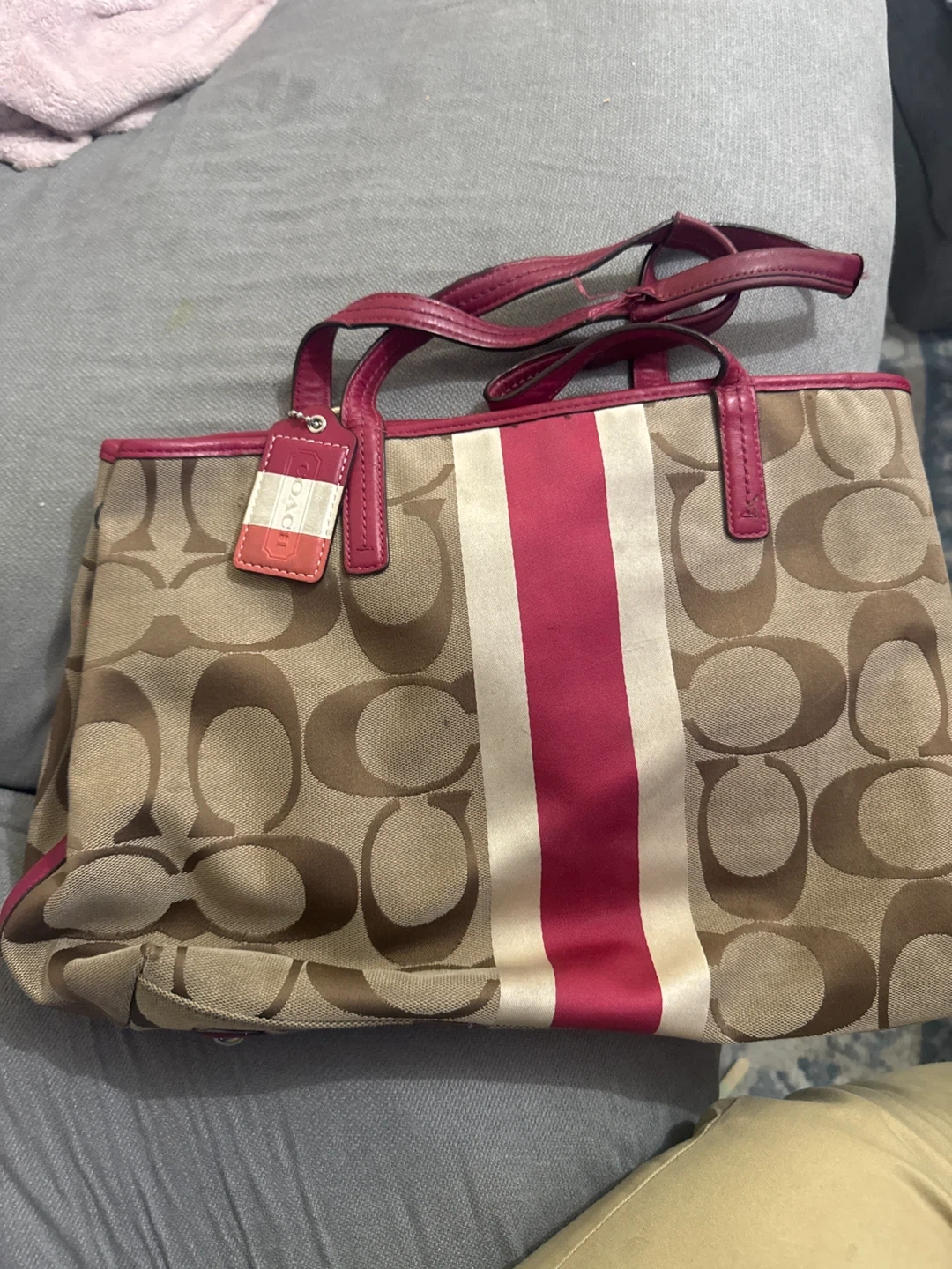 Authentic Coach tote bag with signature monogram print and pink stripe detail. Interior is a vibrant pink with multiple pockets. Leather trim and handles. Includes original Coach hang tags.
