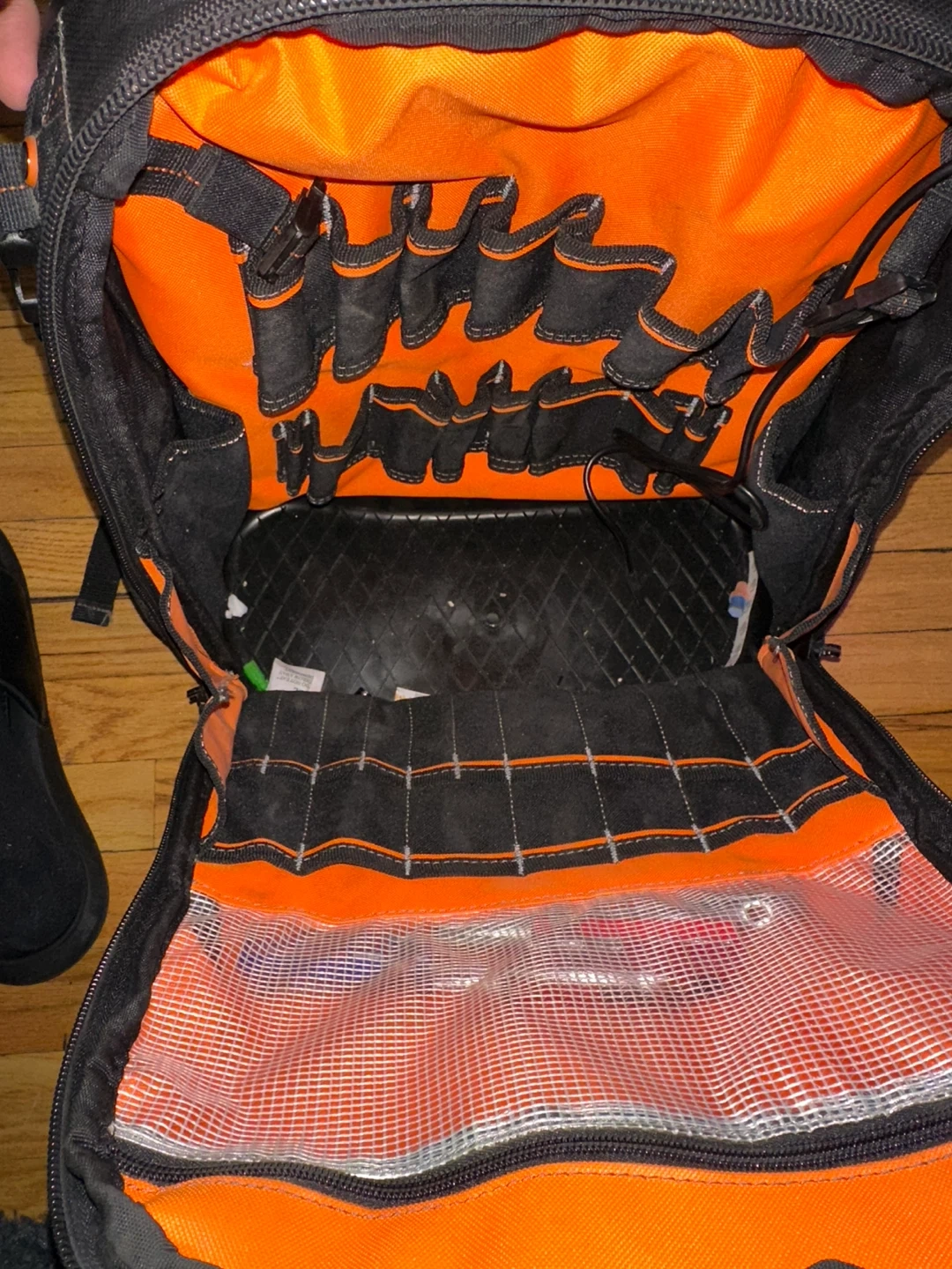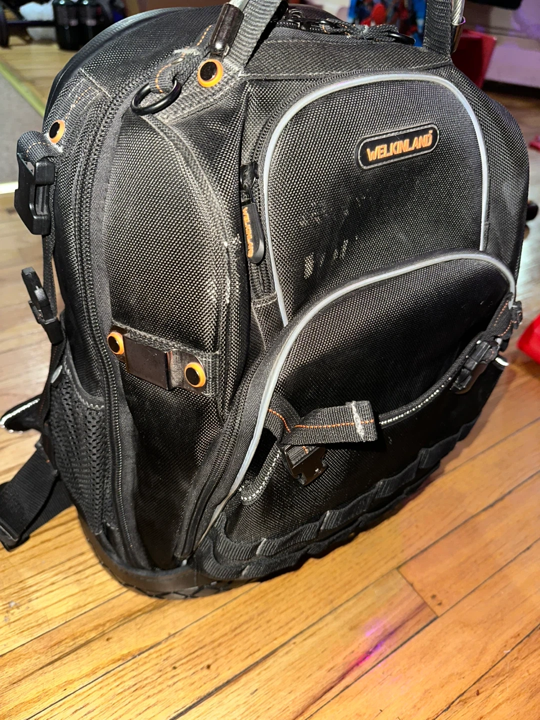 This is a black Welkinland tool backpack. It features multiple compartments and pockets for organization. Durable construction with reinforced stitching. It's perfect for carrying tools and equipment on the go! 1 time use, and port charger for power bank