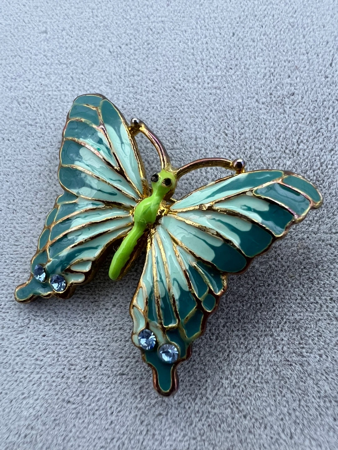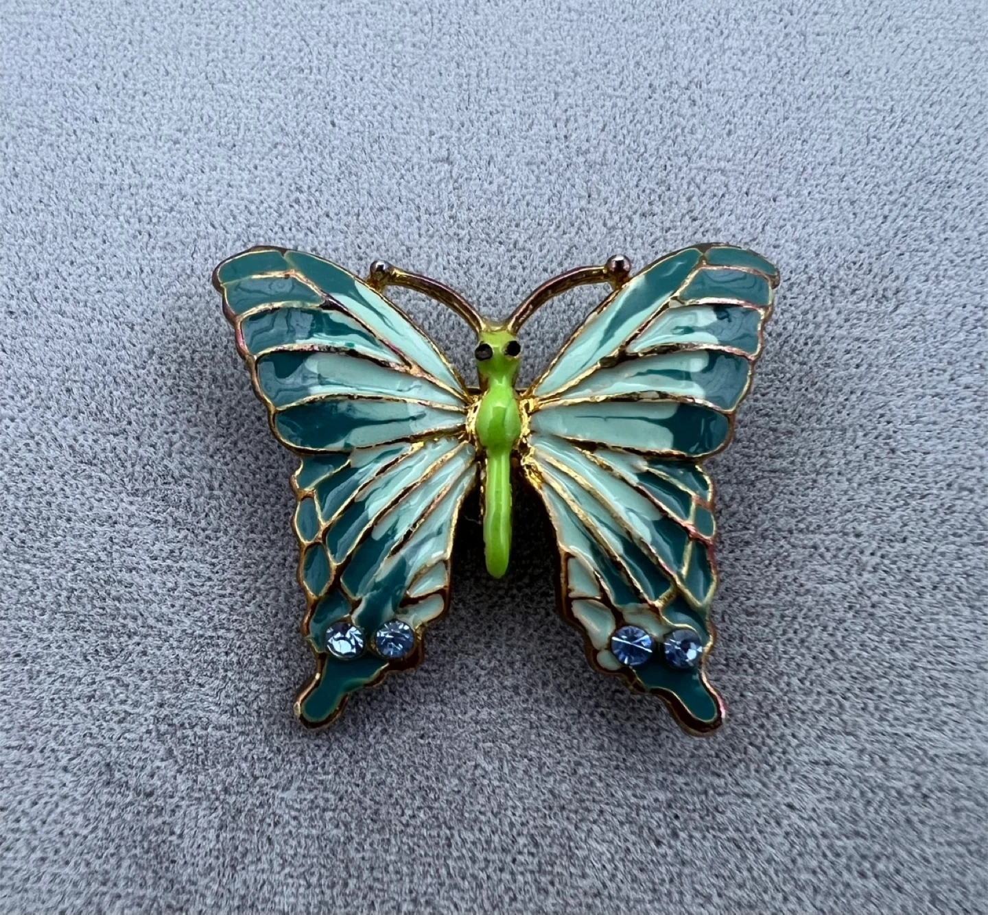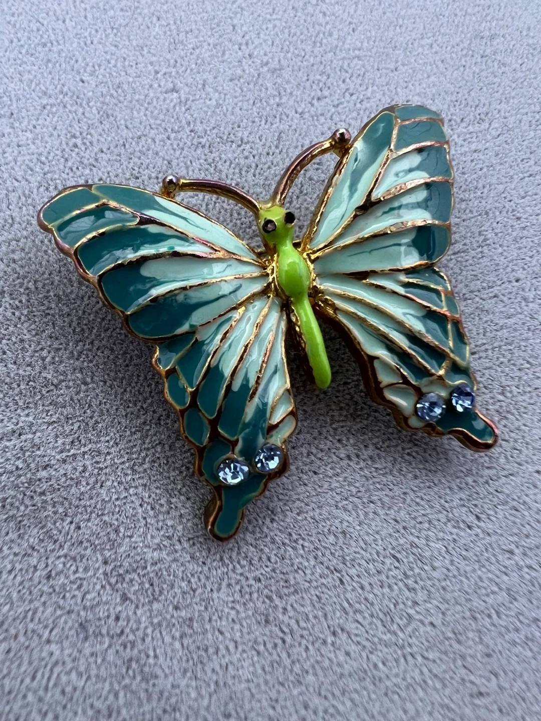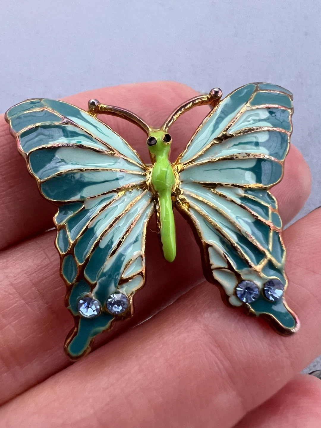Green enamel detailing and small blue rhinestones on the wings