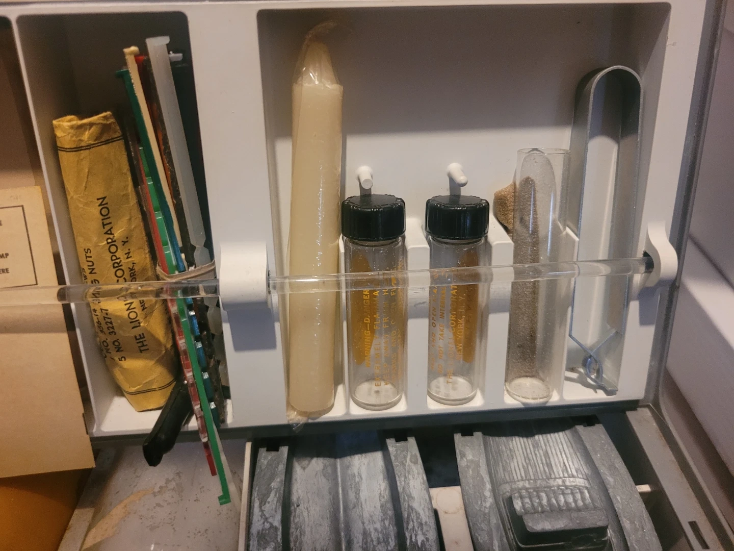 This is The Lionel Corporation Plastics Engineering Lab II. It includes various molds, a yellow bottle, a white granular substance in a bottle, and other small components. Some parts appear to be made of metal and plastic.