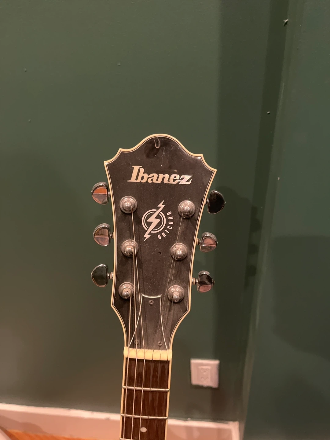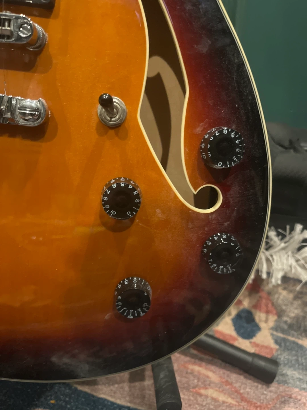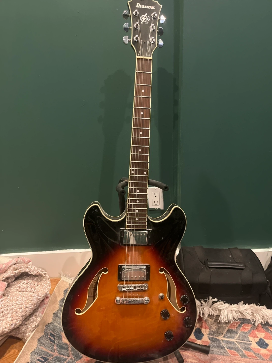 This is an Ibanez hollow-body electric guitar. It's in a classic sunburst finish. It has a smooth fretboard and adjustable control knobs.