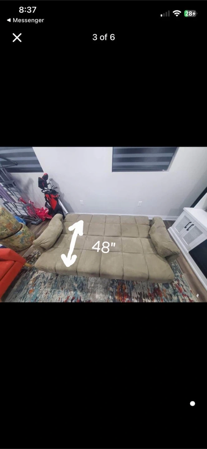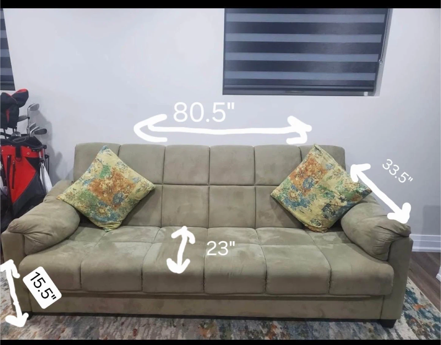 This taupe suede sofa bed is 80.5" wide and 33.5" deep. It's 23" high at the seat and 15.5" high at the base. It comes with two decorative pillows. It's a comfy spot for sitting or sleeping! Pick up only