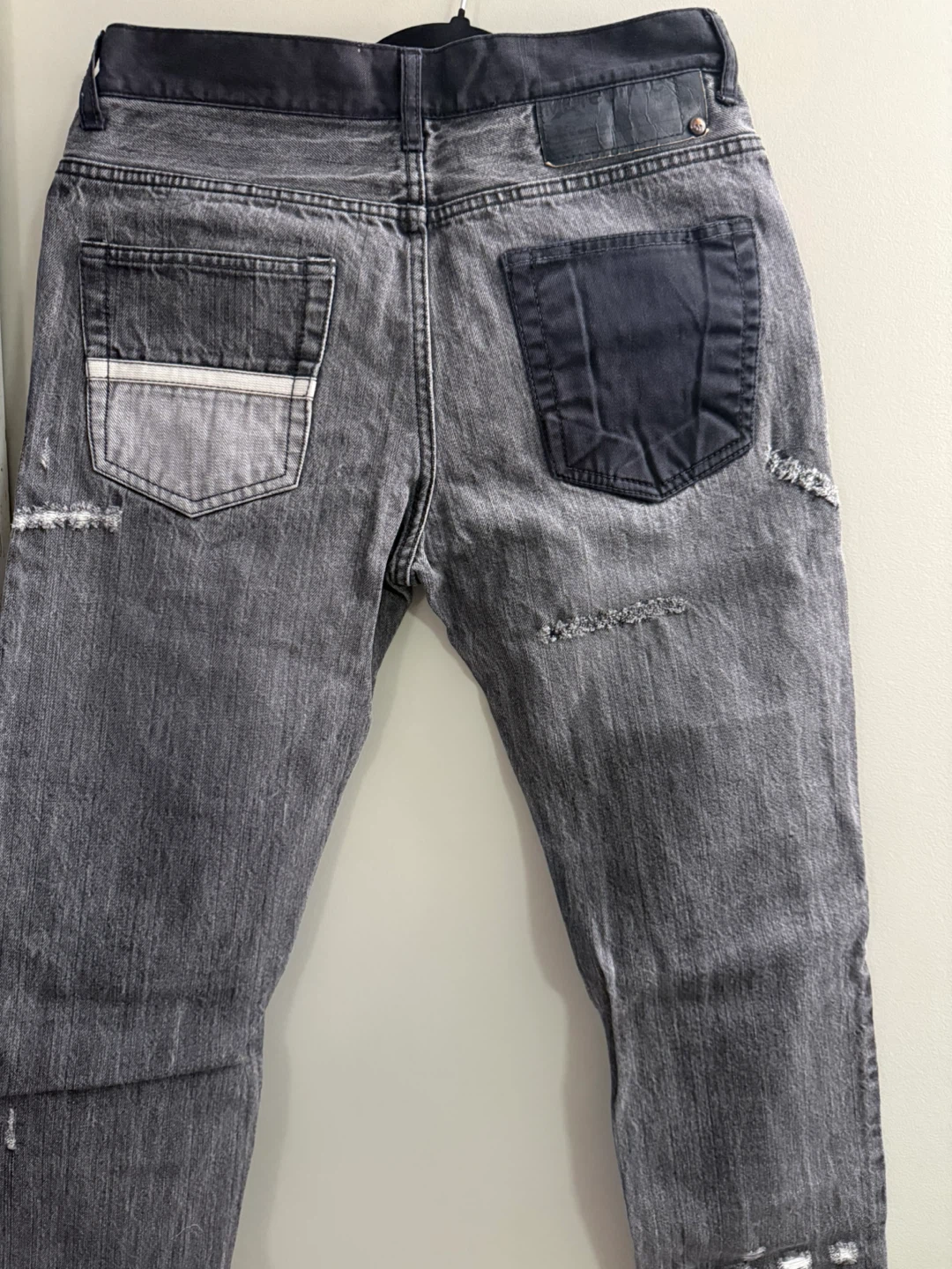 Selling a pair of grey distressed jeans with patchwork detailing! These jeans have a unique, stylish look with various patches and distressed elements throughout. They're perfect for adding an edgy touch to your wardrobe