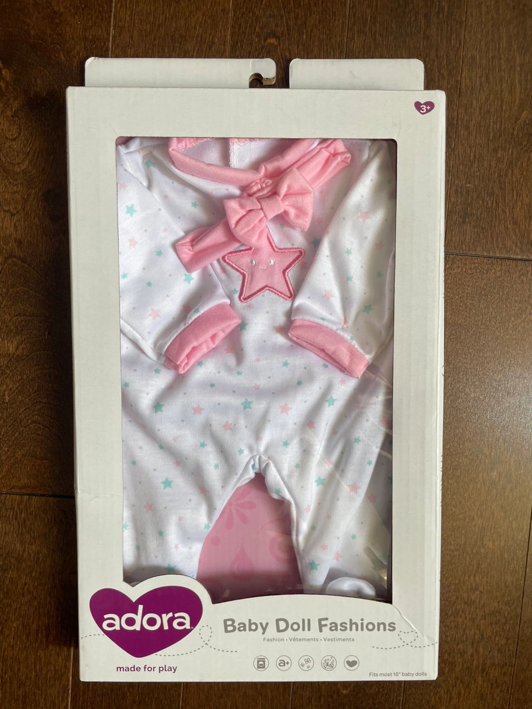 This adorable Adora baby doll fashion outfit is brand new in the box! It's made with high-quality materials and fabrics and is 100% machine washable. Fits most 16" baby dolls. It's a trendy, cute Adora outfit!