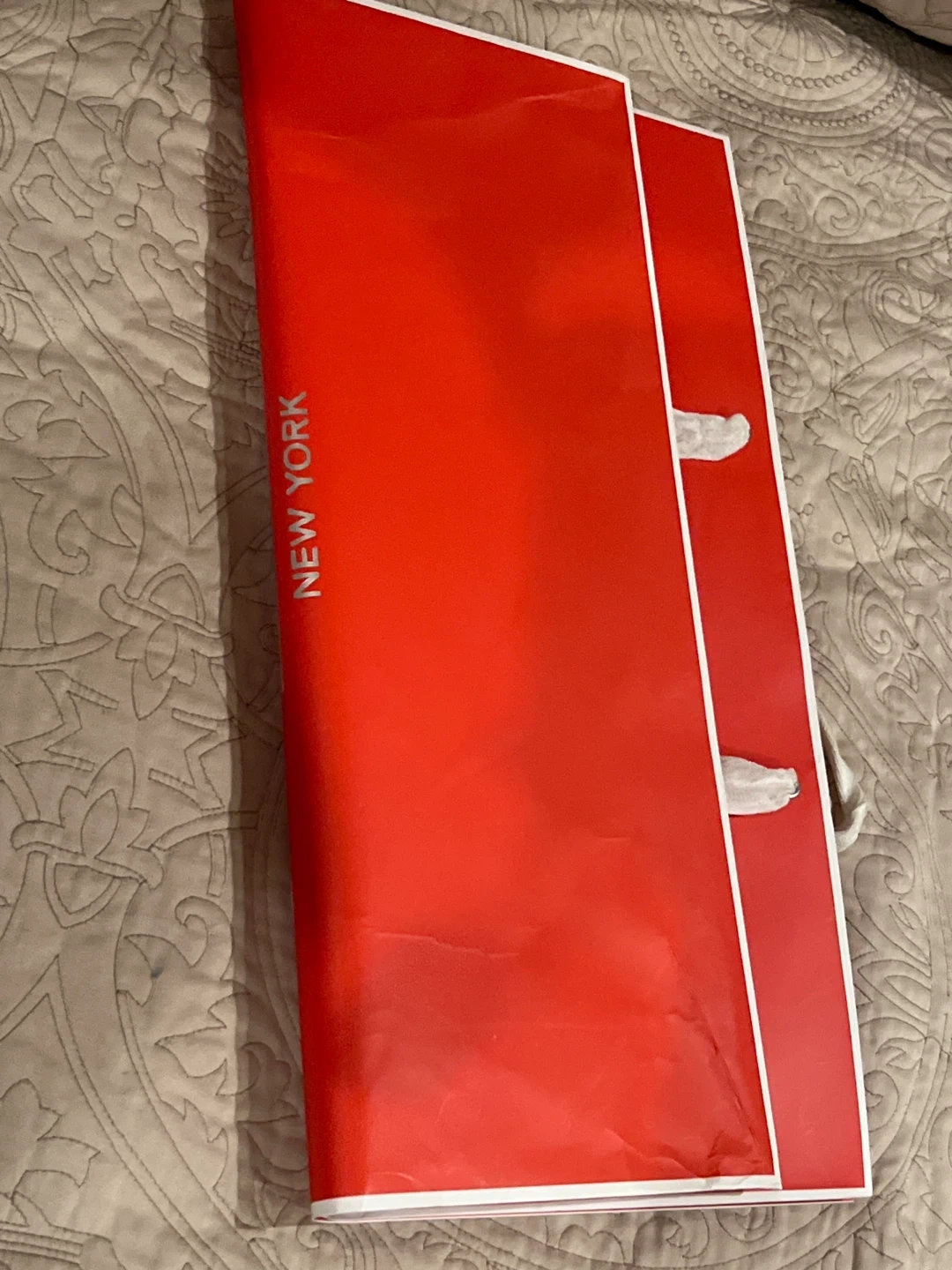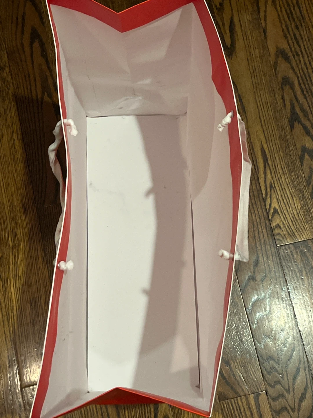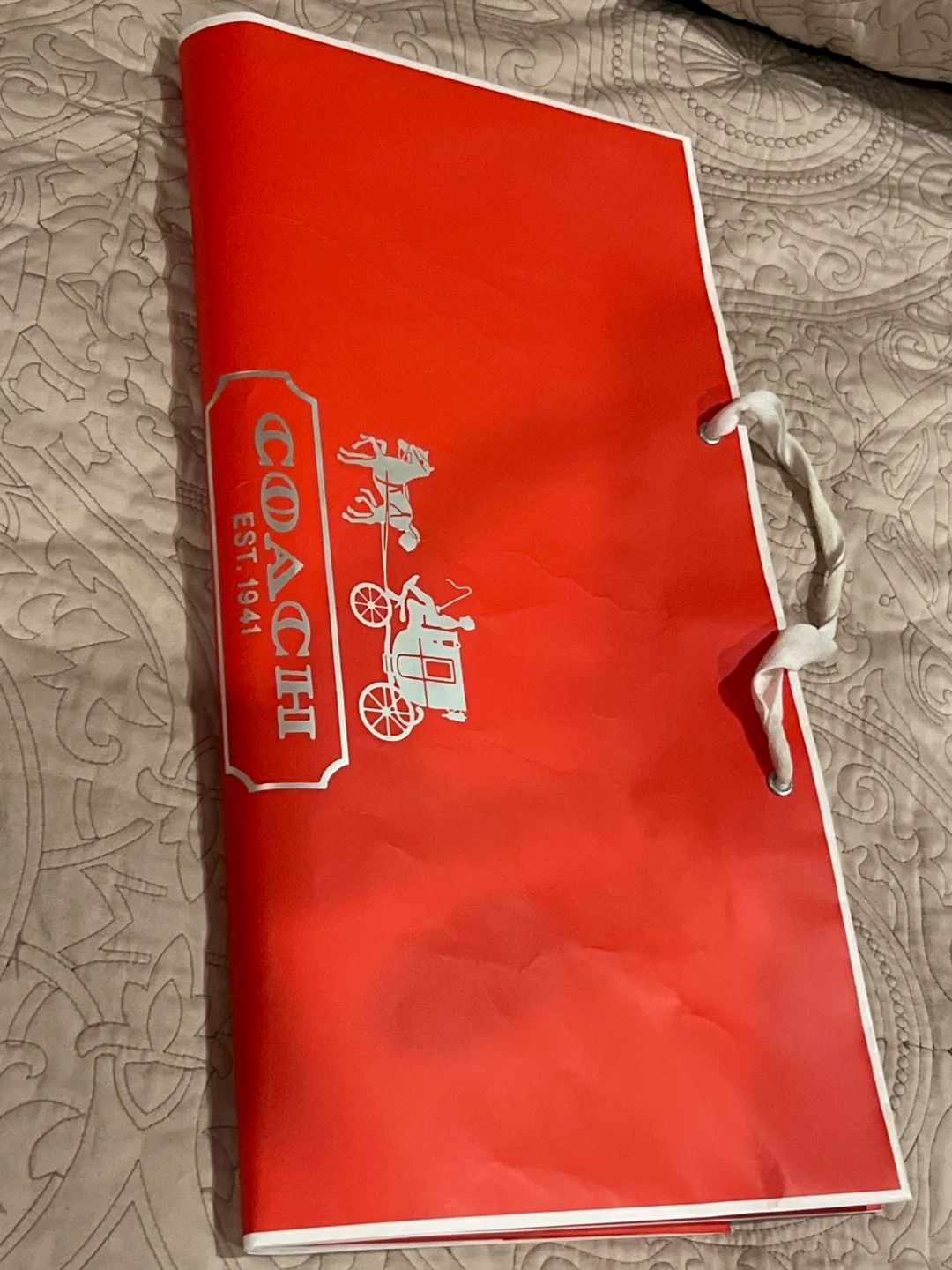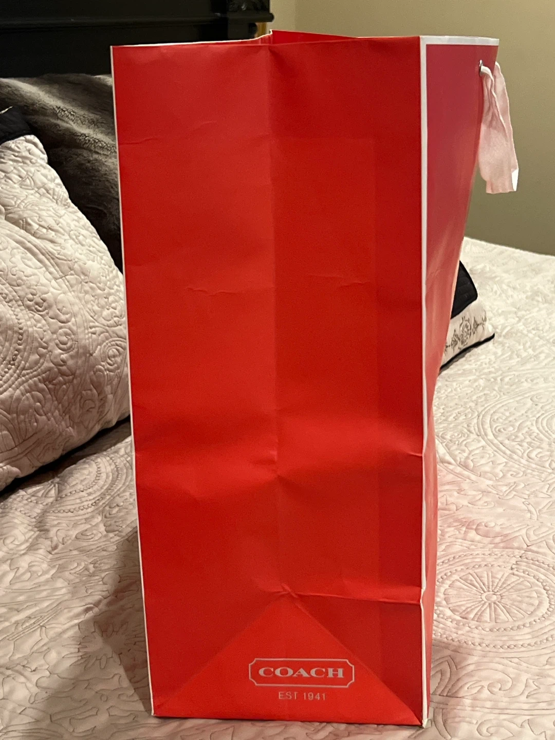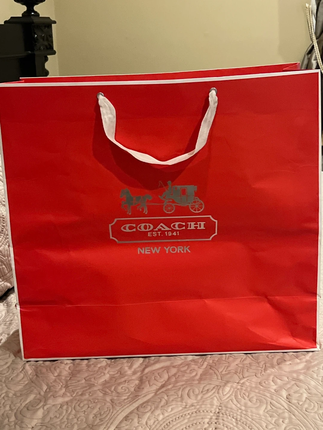 This is a red Coach shopping bag. It has white rope handles and the Coach logo. Bag is empty and ready for use. Aprox measurements. 18.5” long 20” wide and 7.5 side