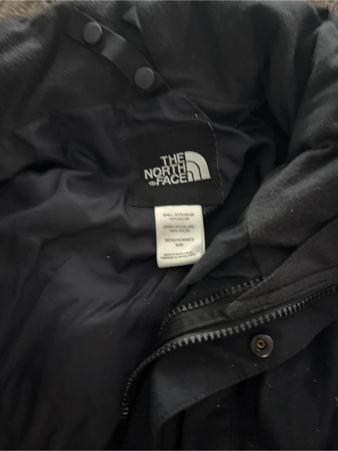 This is a black winter fall jacket from The North Face. It's a men's size medium. Shell exterior is 100% nylon and lining is 100% nylon.