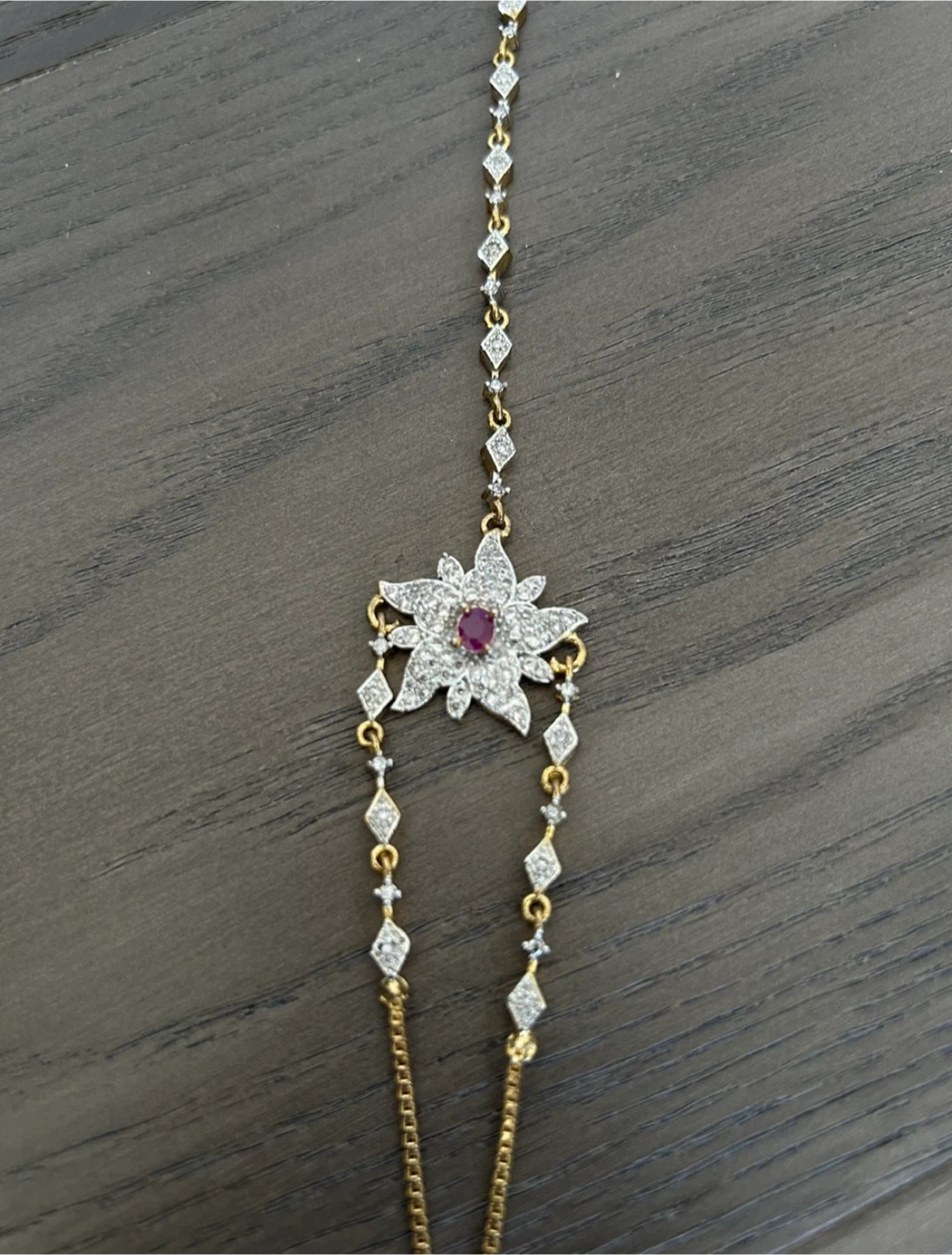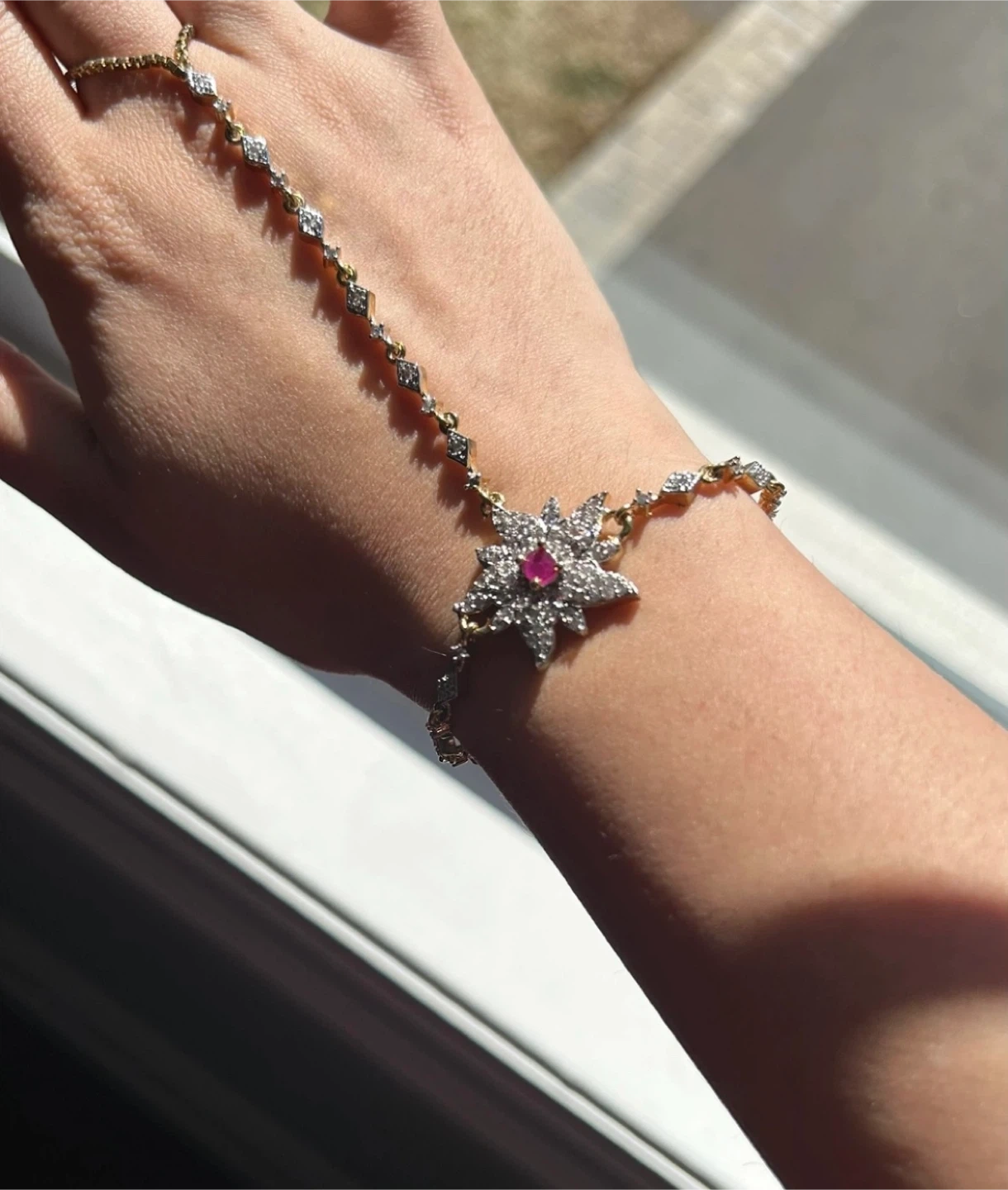 Features a floral design with a red stone surrounded by clear cubic zirconia