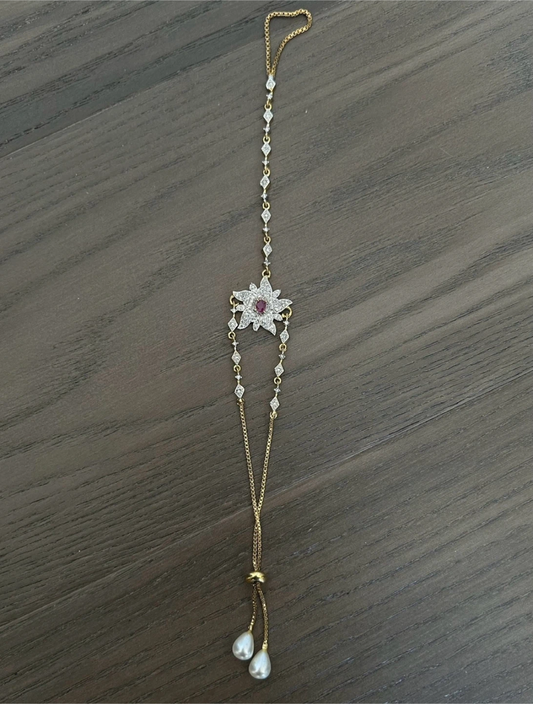 Features a floral design with a red stone surrounded by clear cubic zirconia