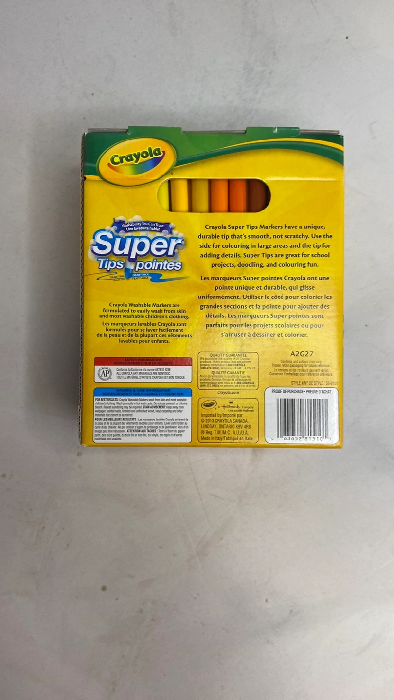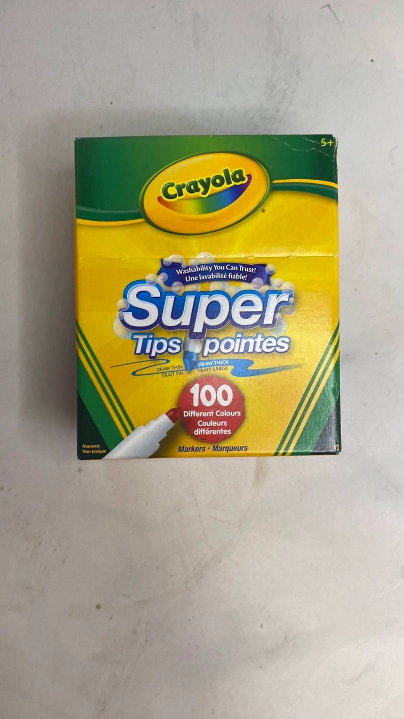 New box of 100 Crayola Super Tips Markers. Washable markers. Unique durable tip, smooth, not scratchy. Great for school projects, doodling, and colouring fun.
