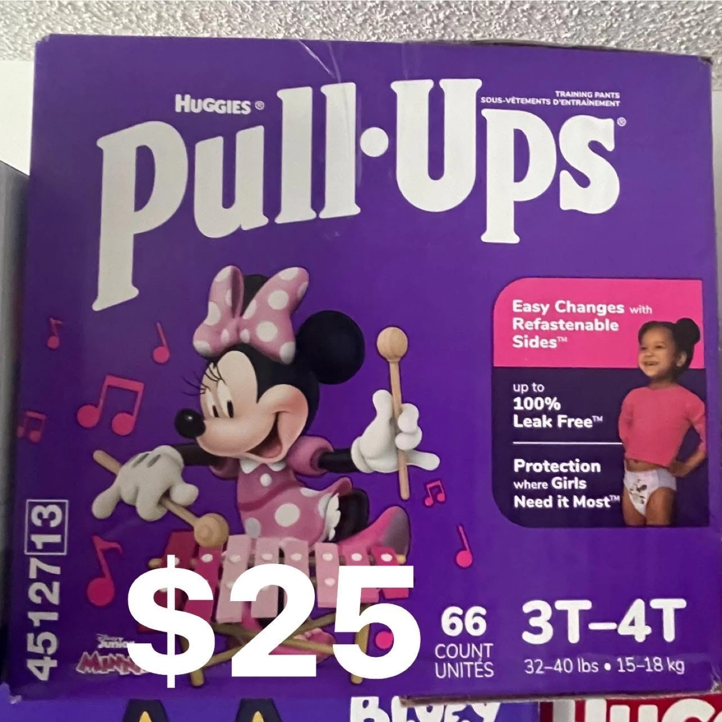 Huggies Pull-Ups training pants for girls, size 3T-4T. Comes with 66 count. Features easy changes with refastenable sides and up to 100% leak-free protection. These are sized for 32-40 lbs or 15-18 kg.