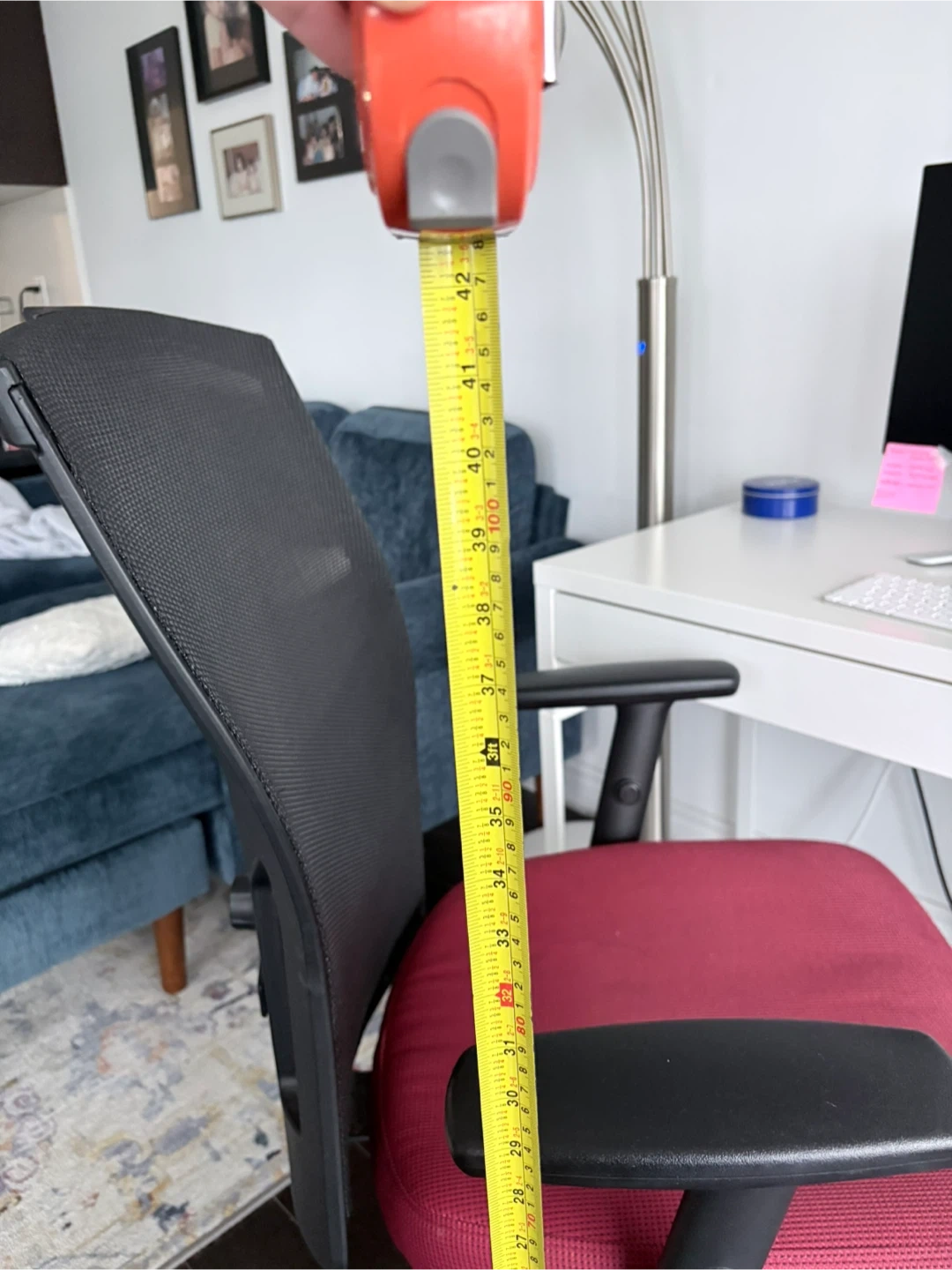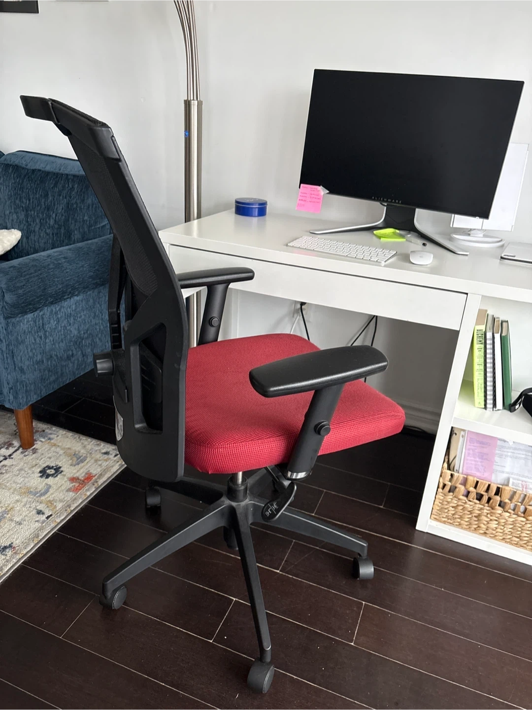 Selling a comfy office chair! It has a red seat and black mesh back, perfect for working from home. The chair is in excellent condition and ready for a home/office workspace.