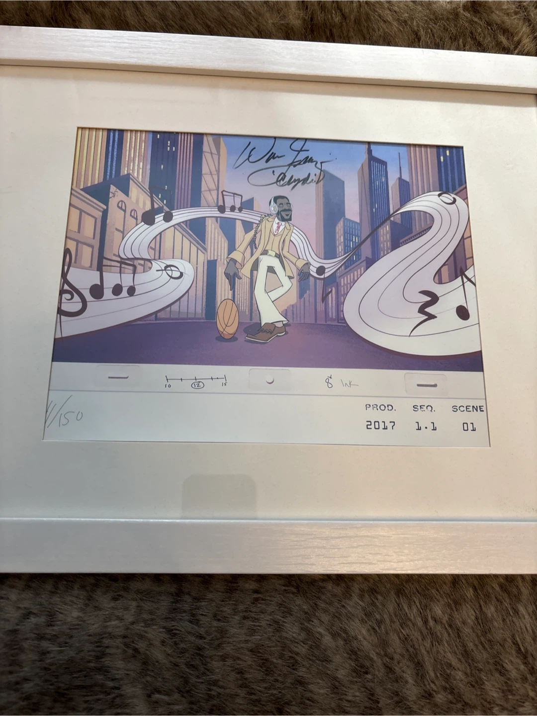 Walt Fraser autographed, animation cel,numbered 11 of 150. It features a character of Walt Frasier with headphones and a basketball, set against a city backdrop with musical notes. The cel is signed and includes production details like date, sequence, and scene number. 13x15 inches
