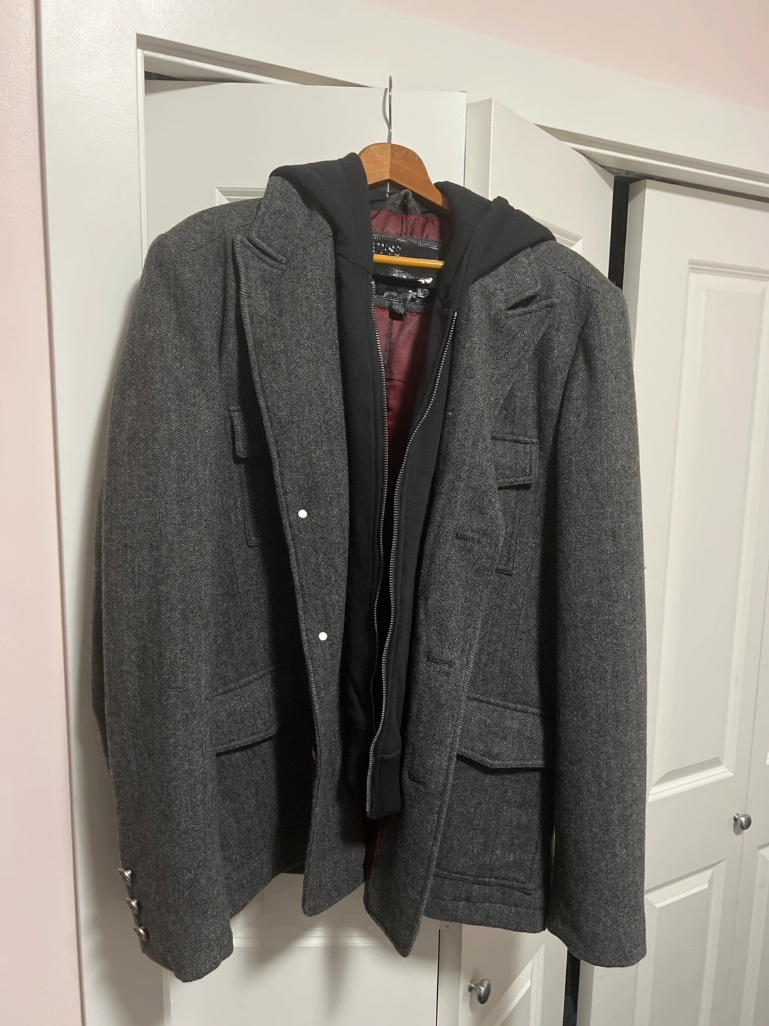 Grey peacoat with a removable hooded liner. Has two large pockets on the front.