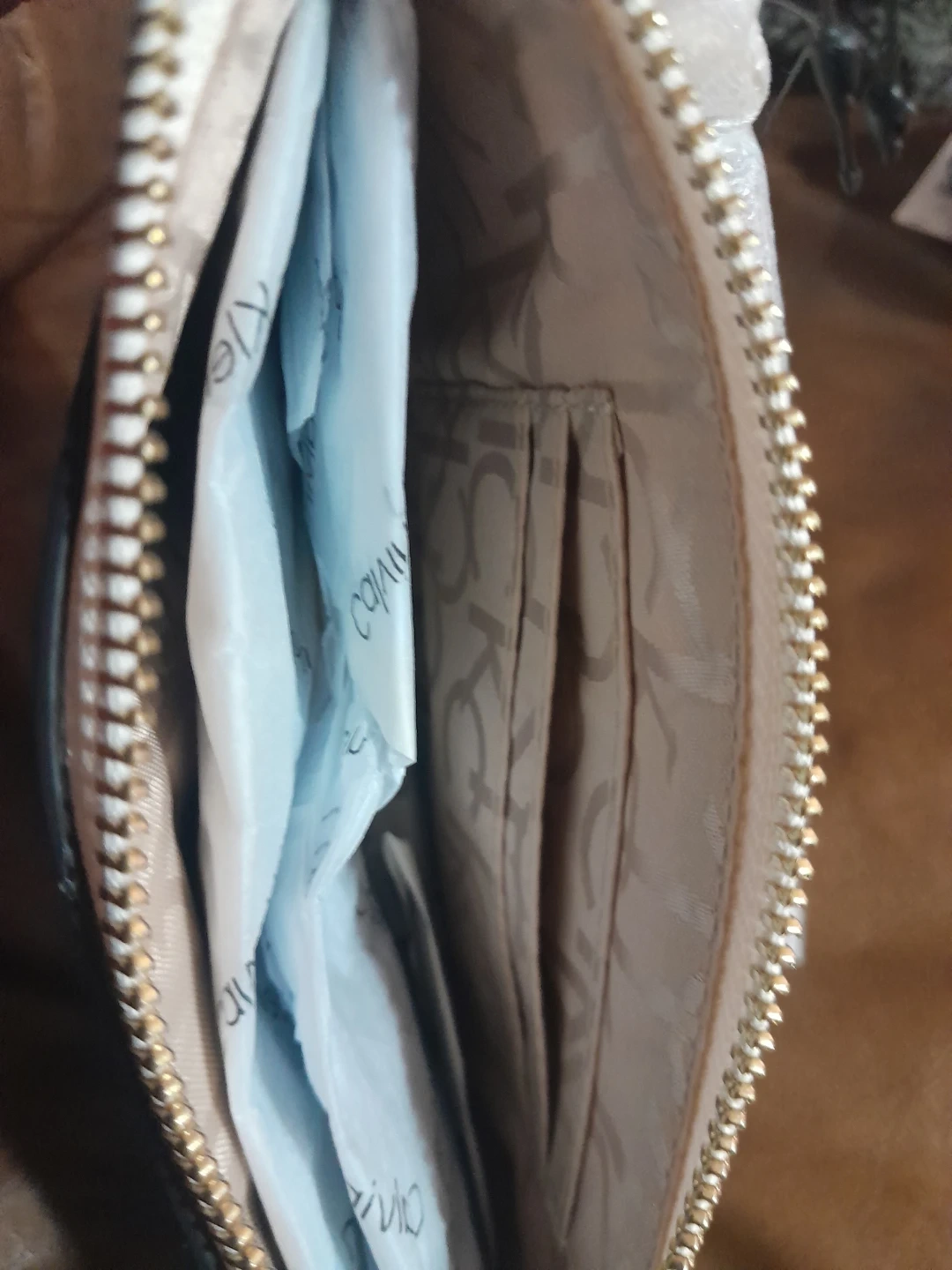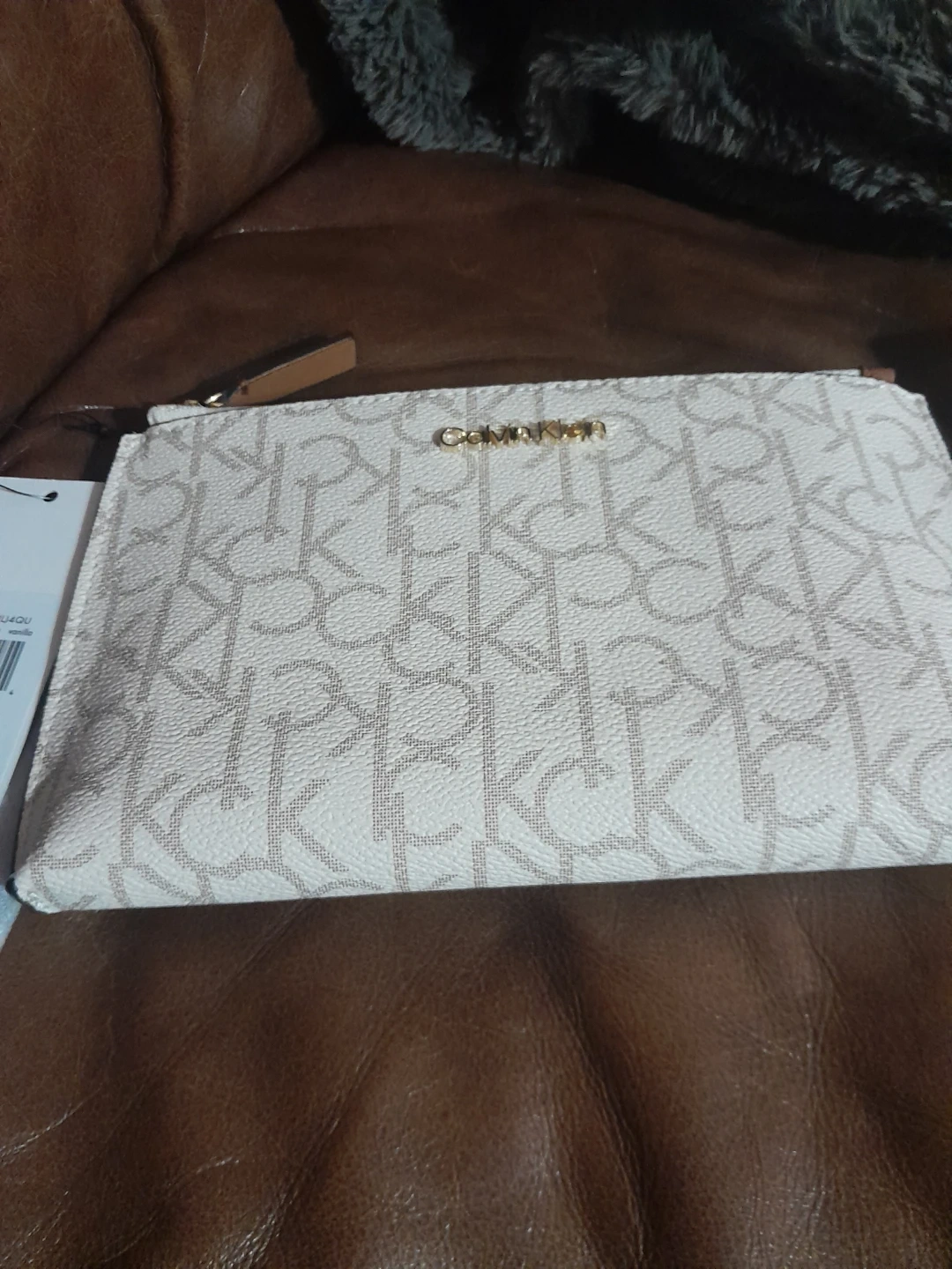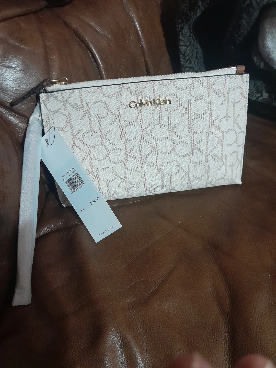 This Calvin Klein wristlet pouch features a repeating logo print. It's a convenient size for essentials. Interior has slip pockets. Brand Brand new with tags.