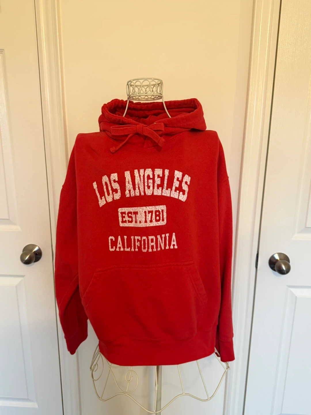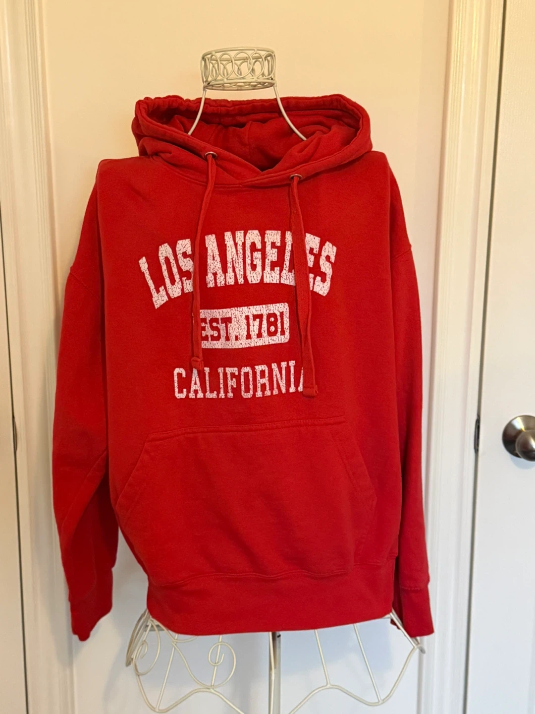Republic Blues red hoodie featuring "Los Angeles California EST 1781" graphic. It's a size large with front pocket. Perfect for casual wear!