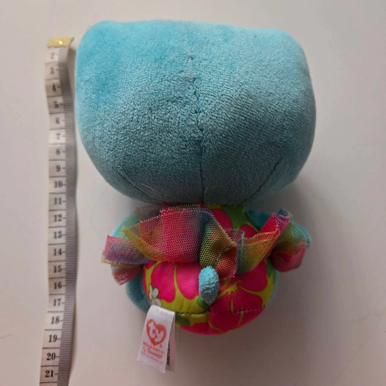 Adorable TY Hello Kitty by Sanrio plush in a bright turquoise blue, wearing a tropical floral dress and rainbow mesh tutu. She has a pink and white flower on her ear and all original tags sewn in place. Approx 17 cm tall (see measuring tape in photos).