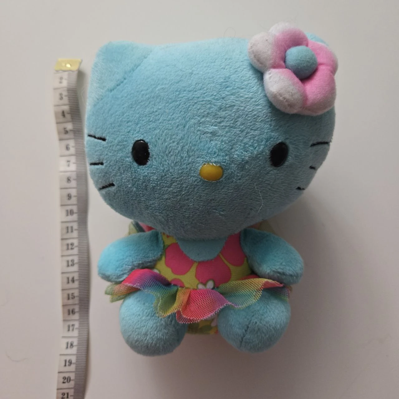 Adorable TY Hello Kitty by Sanrio plush in a bright turquoise blue, wearing a tropical floral dress and rainbow mesh tutu. She has a pink and white flower on her ear and all original tags sewn in place. Approx 17 cm tall (see measuring tape in photos).
