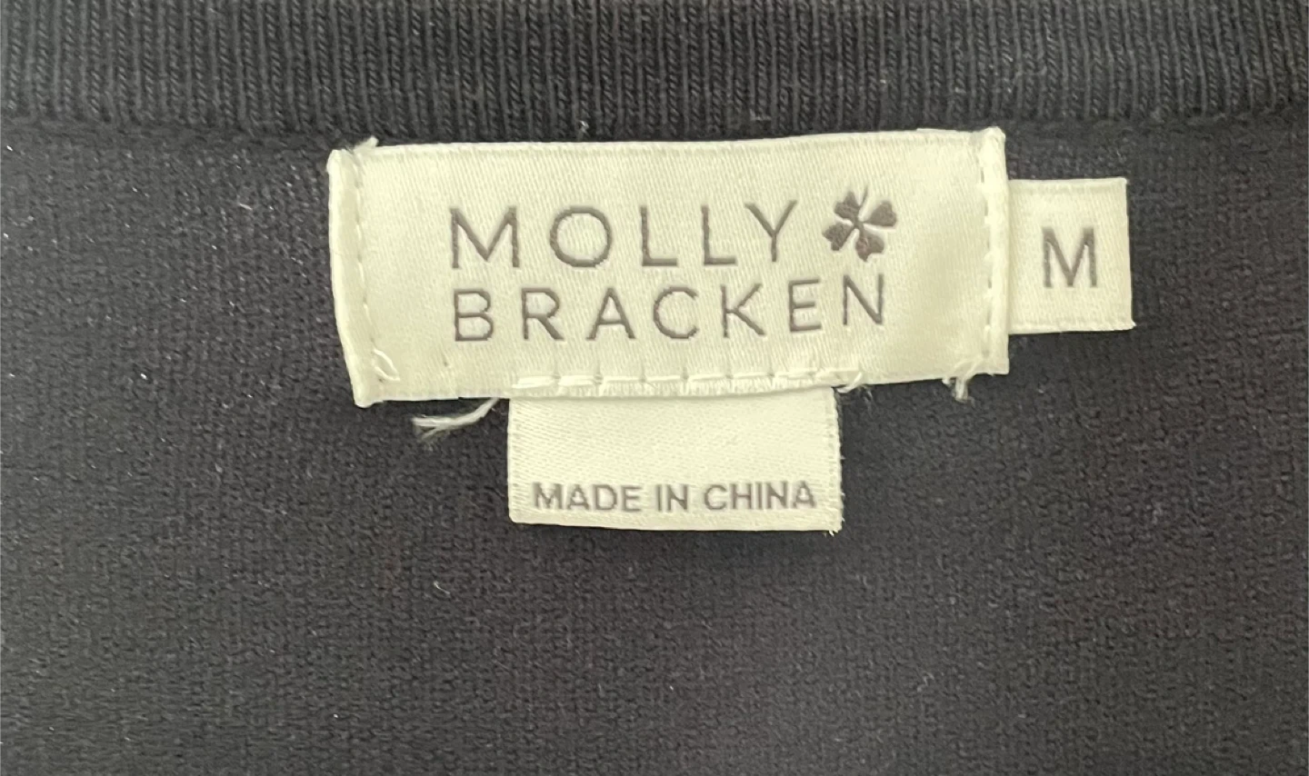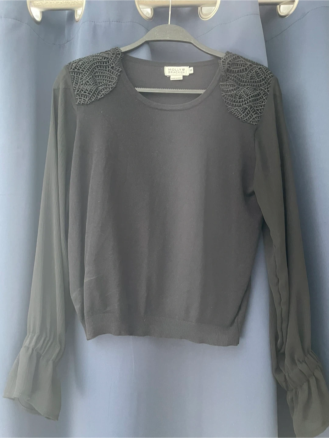 This black long sleeve top from Molly Bracken features intricate lace detailing on the shoulders. The sleeves are made of sheer chiffon and have ruffled cuffs. It's a stylish piece.