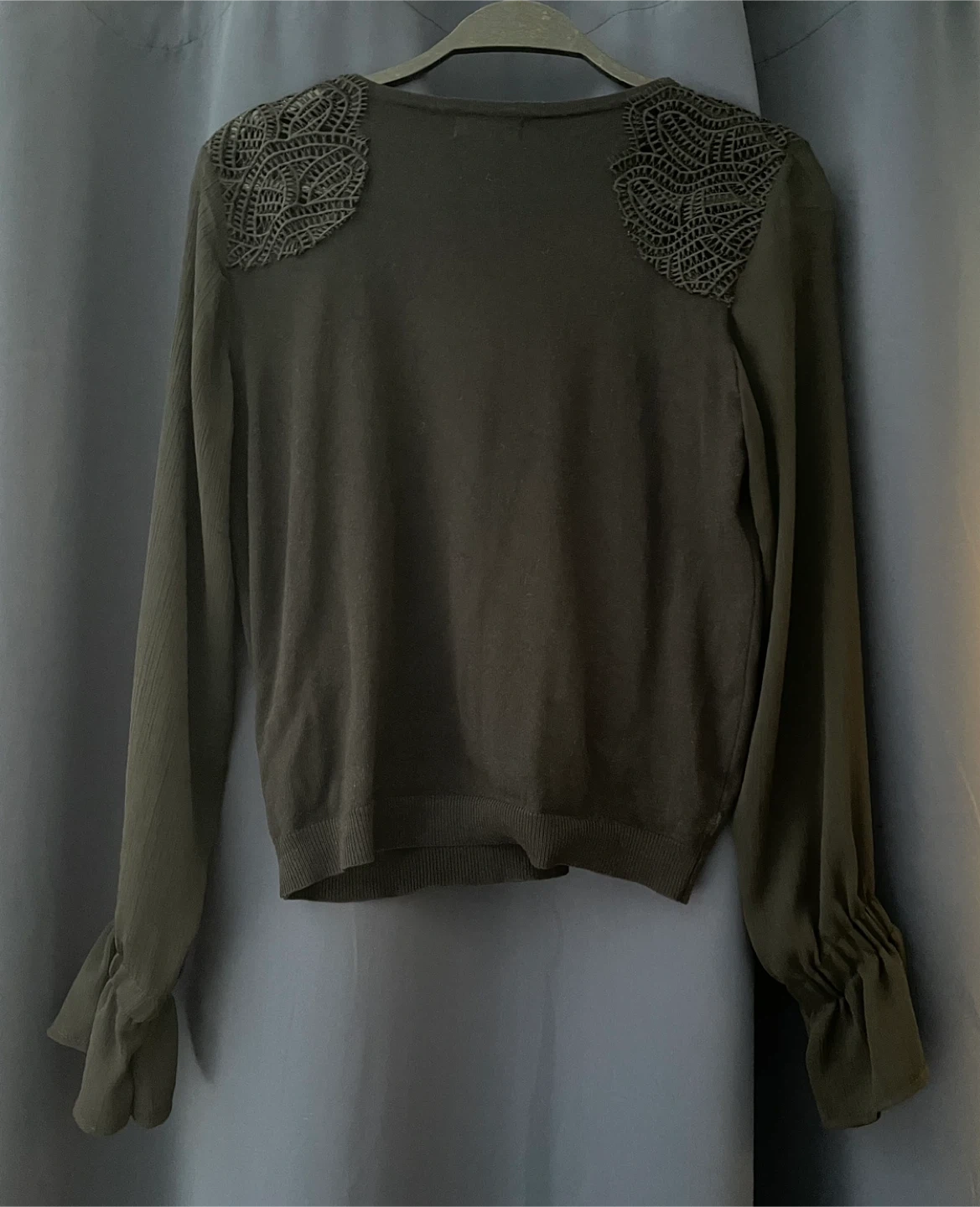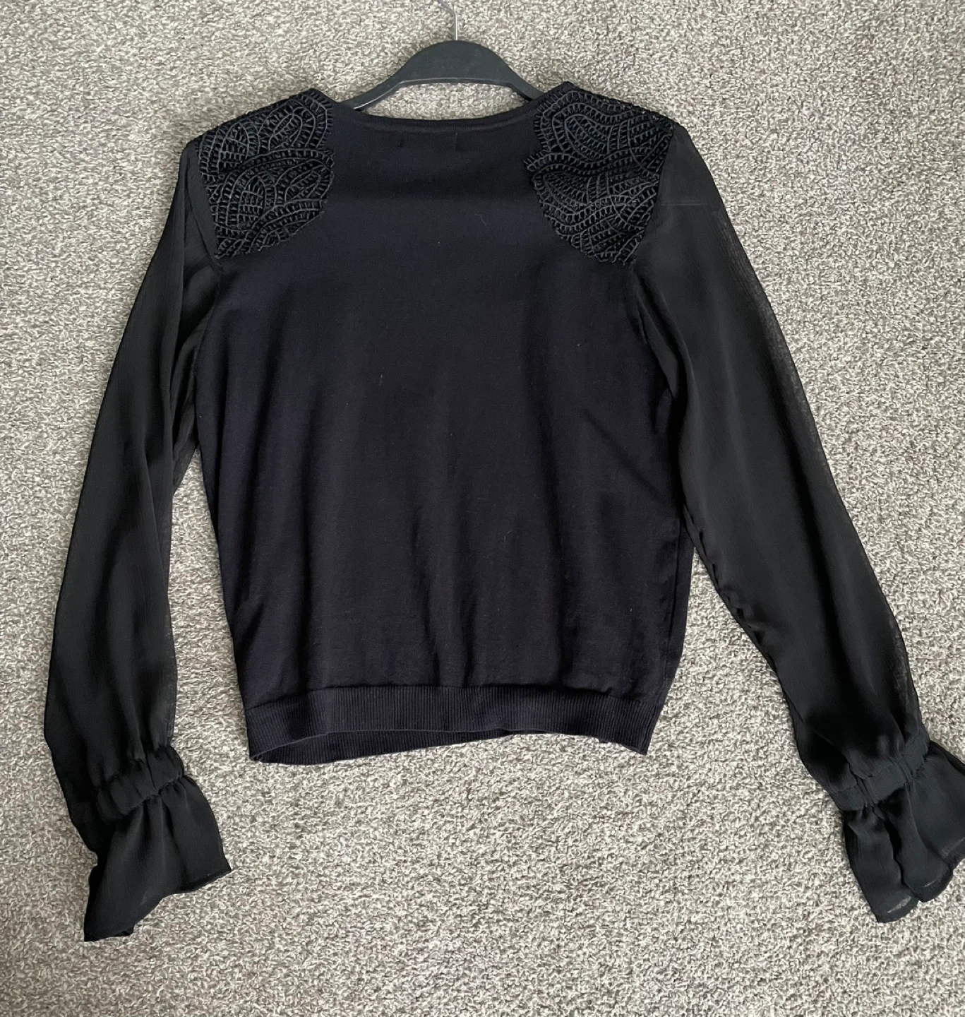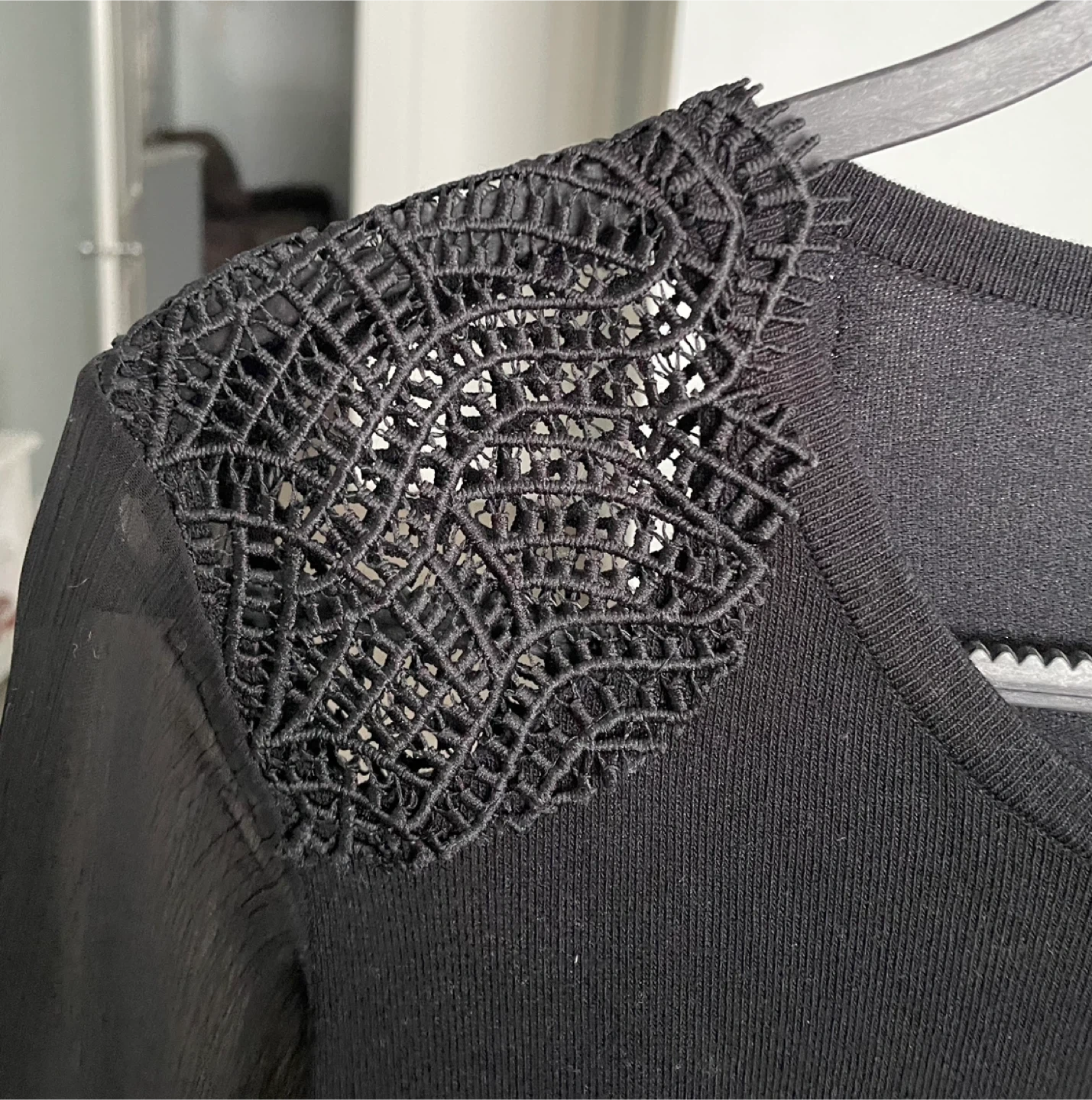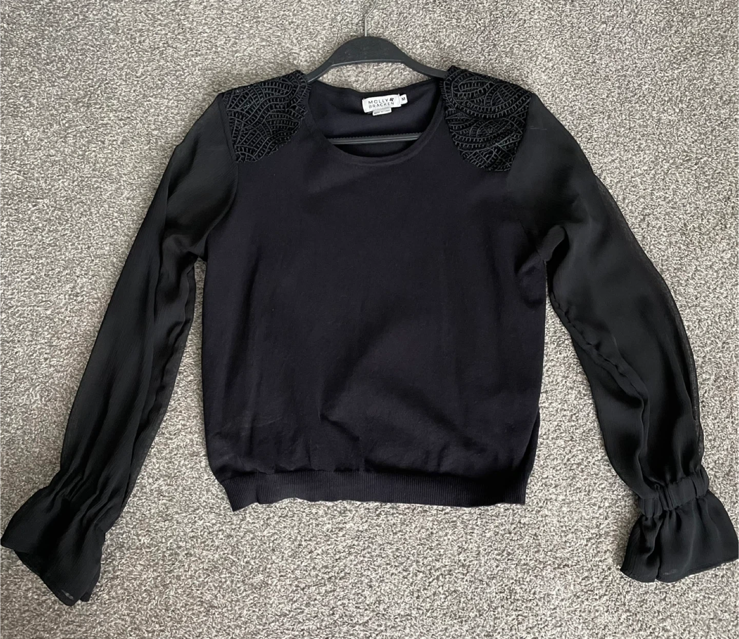 This black long sleeve top from Molly Bracken features intricate lace detailing on the shoulders. The sleeves are made of sheer chiffon and have ruffled cuffs. It's a stylish piece.