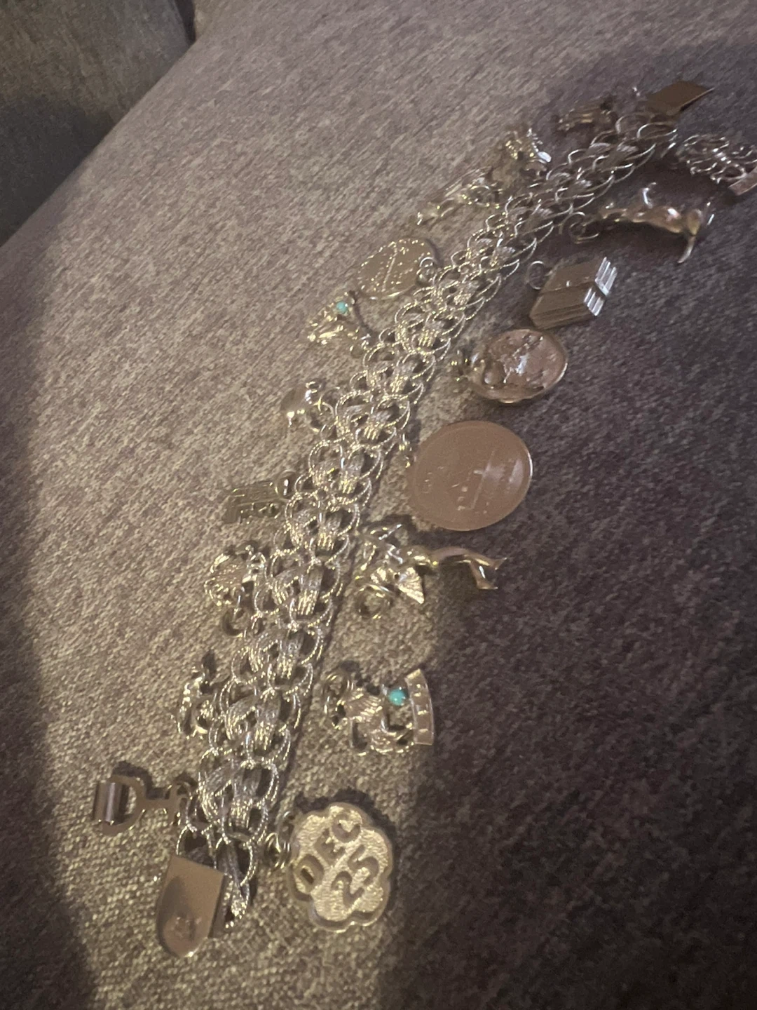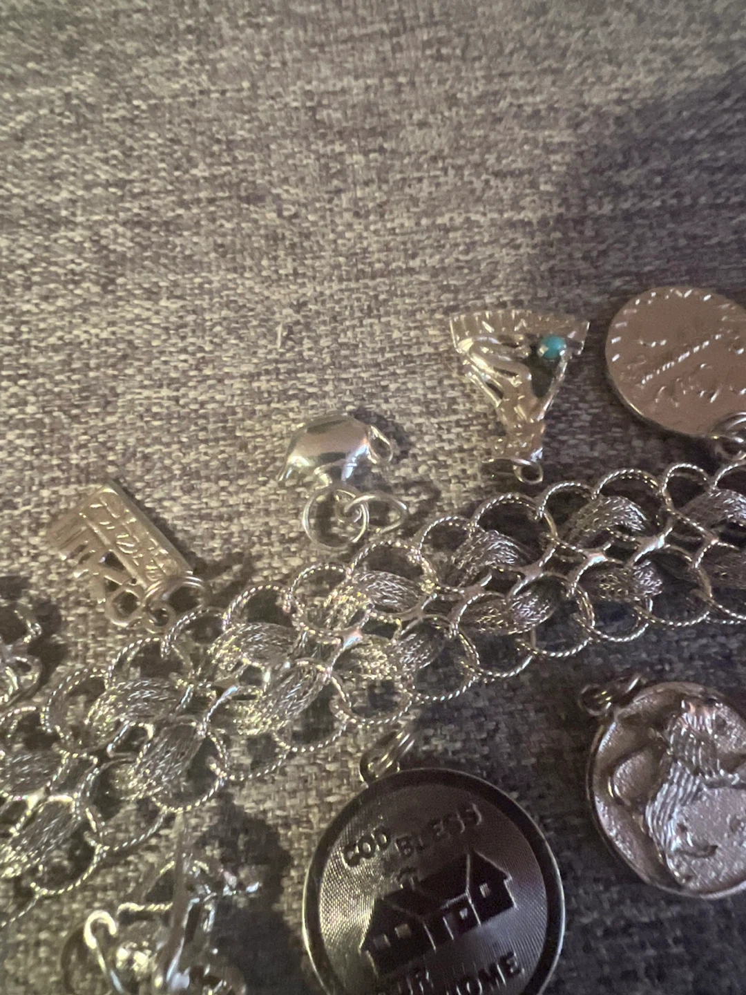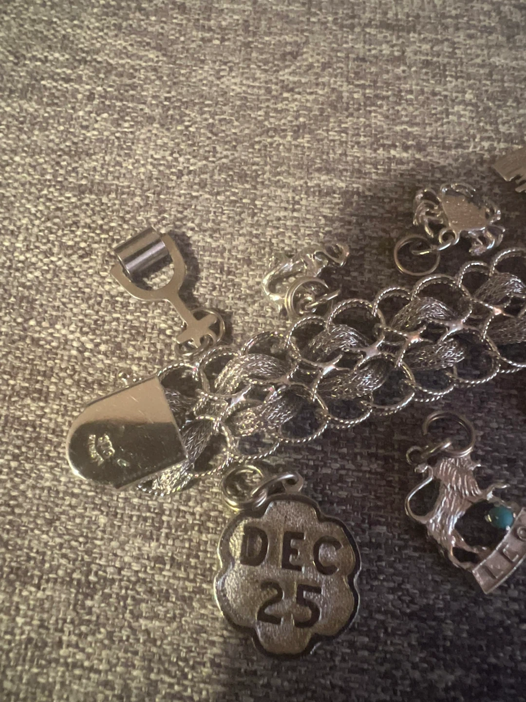A vintage sterling silver charm bracelet featuring multiple detailed charms. It includes a 'Dec 25' charm and a 'God Bless Our Home' charm and others