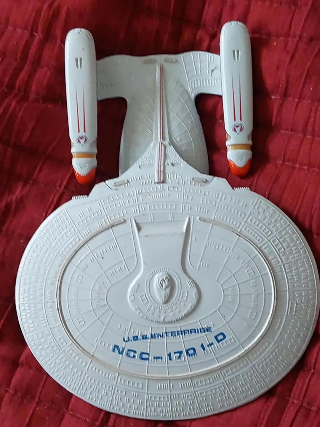 This is a U.S.S. Enterprise NCC-1701-D starship model 1987. It's made of grey metal. The model is grey with red and orange accents. It's a great collectible for Star Trek fans!