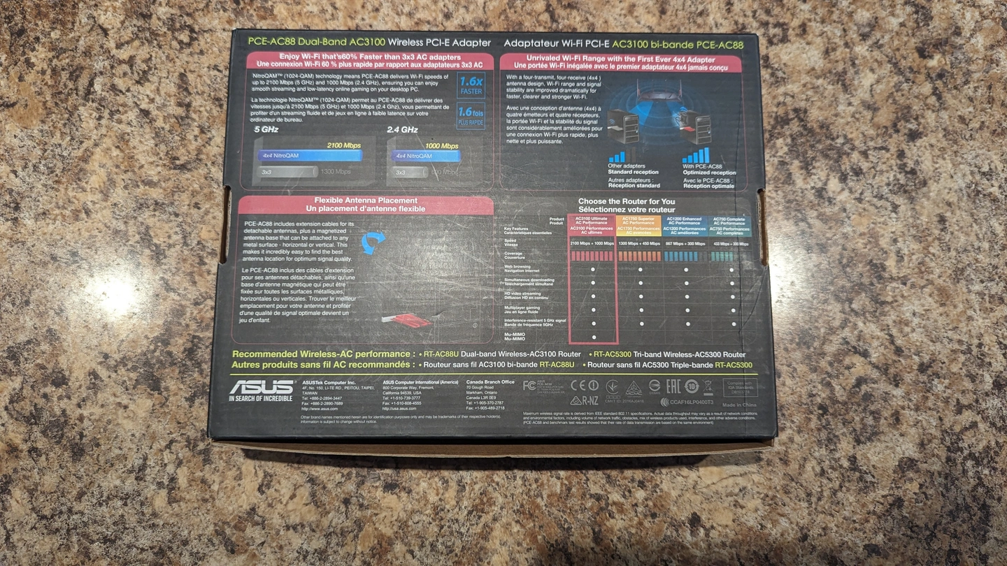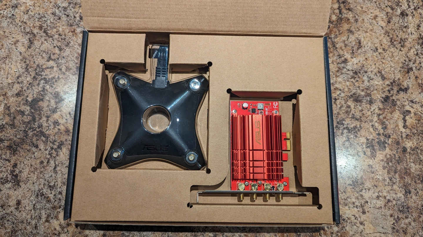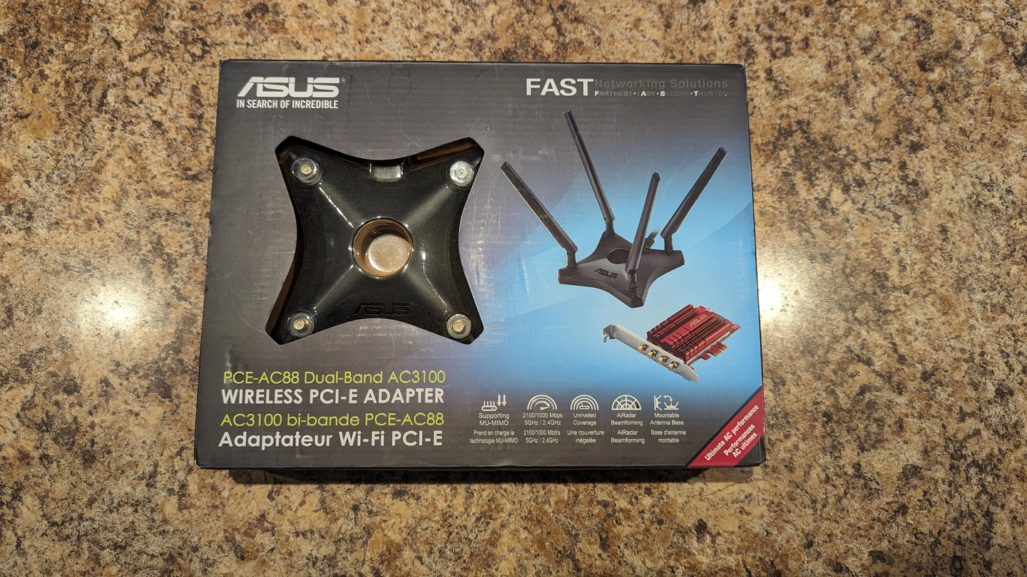 ASUS PCE-AC88 Dual-Band AC3100 Wi-Fi PCIe adapter. Never used, open box. Supports 802.11ac with up to 2167 Mbps on 5GHz and 1000 Mbps on 2.4GHz. Includes magnetic antenna base and antenna cables. Great for desktop gaming or streaming.