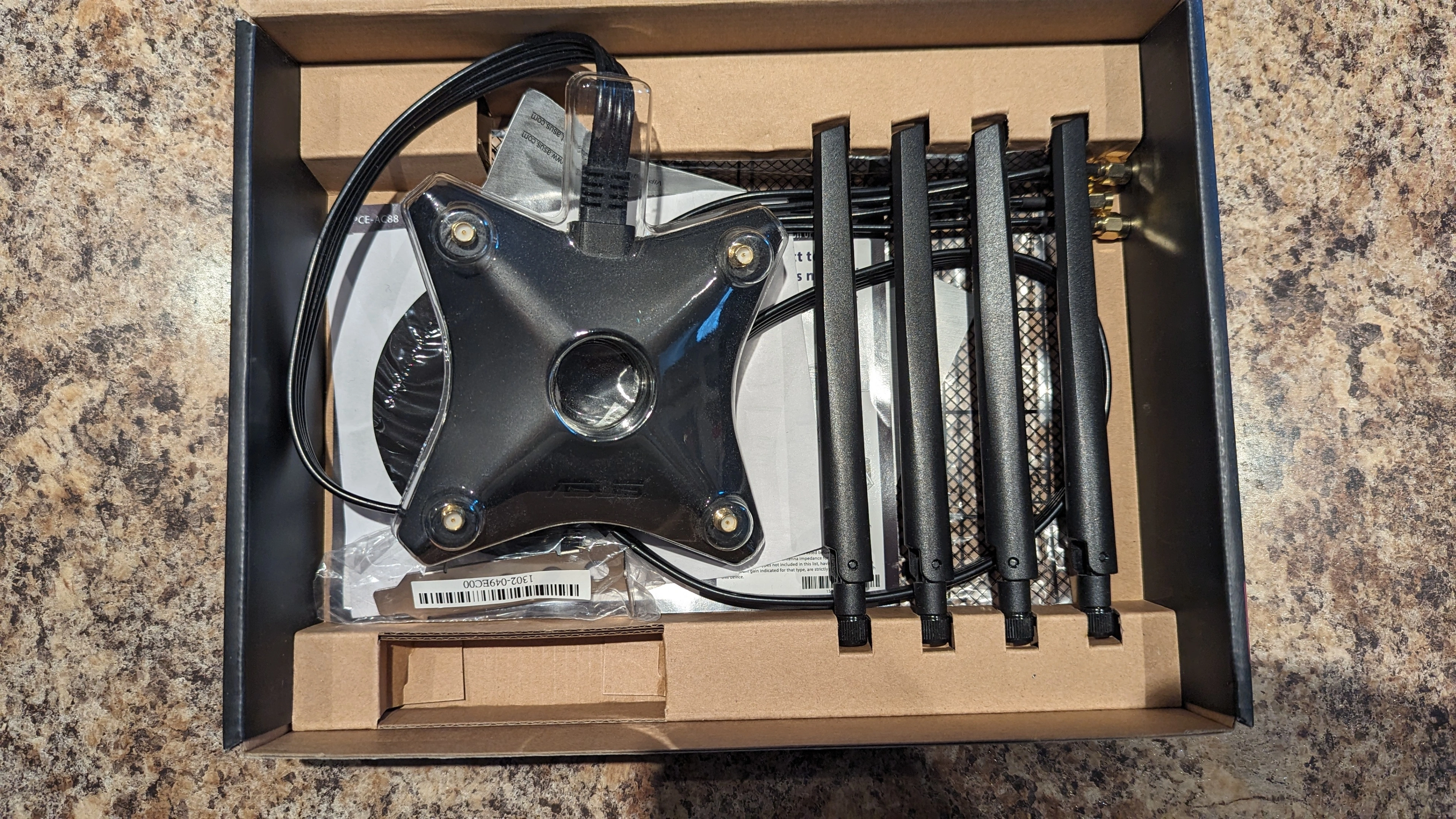ASUS PCE-AC88 Dual-Band AC3100 Wi-Fi PCIe adapter. Never used, open box. Supports 802.11ac with up to 2167 Mbps on 5GHz and 1000 Mbps on 2.4GHz. Includes magnetic antenna base and antenna cables. Great for desktop gaming or streaming.