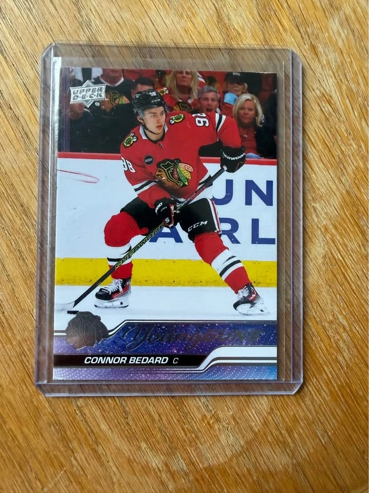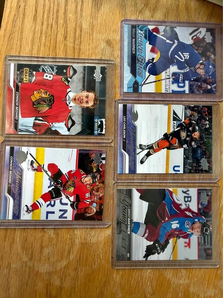 Awesome set of hockey cards here! You get two Connor Bedard cards, one Draft and one Young Guns. Also has Mitch Marner Young Guns, Leo Carlsson Young Guns, and Mikko Rantanen Young Guns. All in plastic protectors.