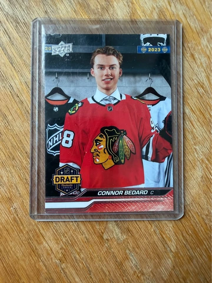 Awesome set of hockey cards here! You get two Connor Bedard cards, one Draft and one Young Guns. Also has Mitch Marner Young Guns, Leo Carlsson Young Guns, and Mikko Rantanen Young Guns. All in plastic protectors.
