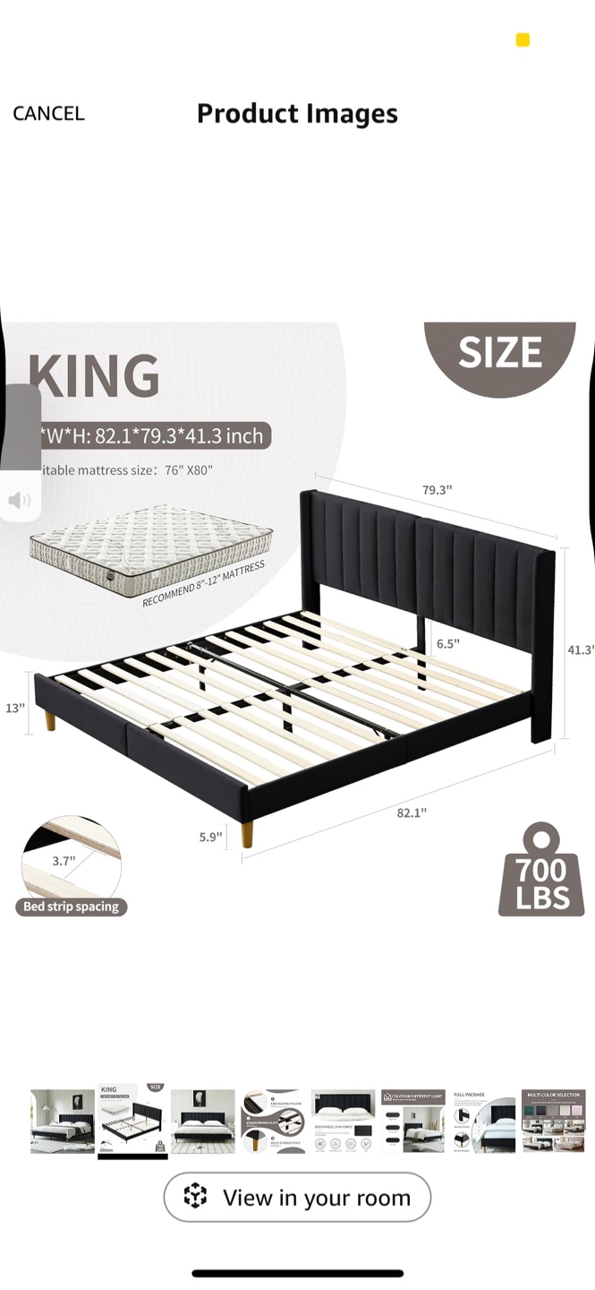 Selling a king size bed frame. It measures 82.1" in width, 79.3" in depth, and 41.3" in height. It can support up to 700 lbs. Recommend 8-12" mattress.