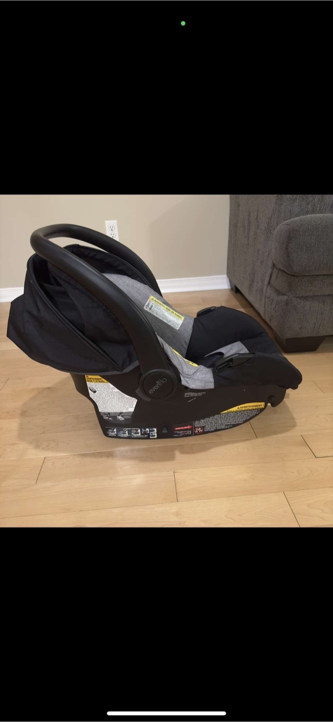 Selling an Evenflo infant car seat in black and grey. It's in great condition and ready for a new family!