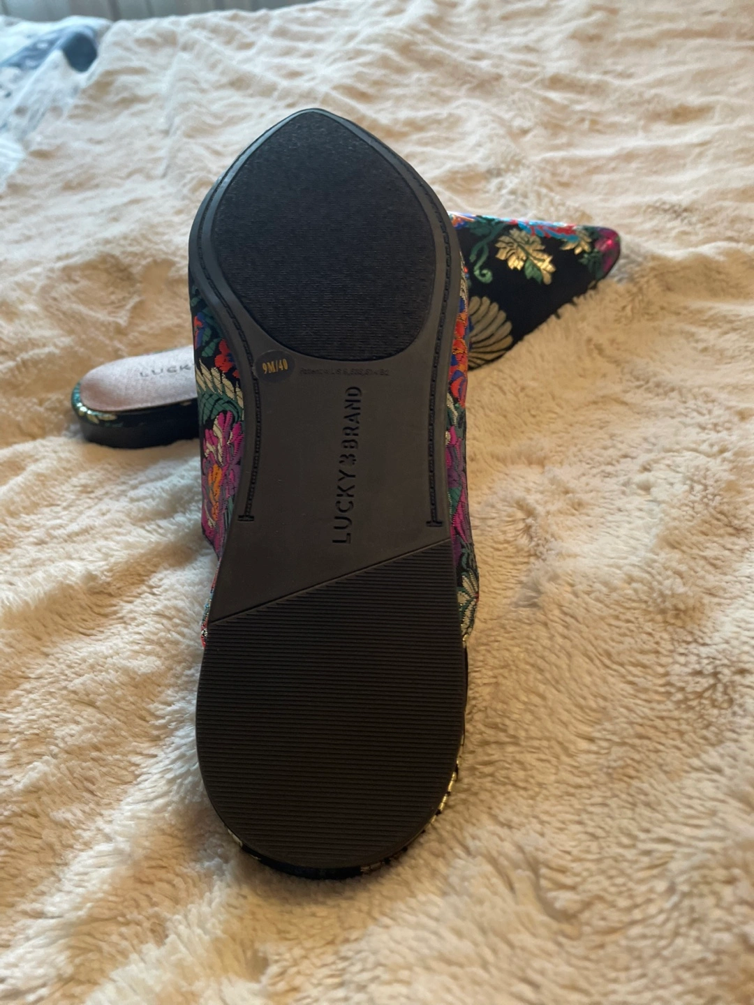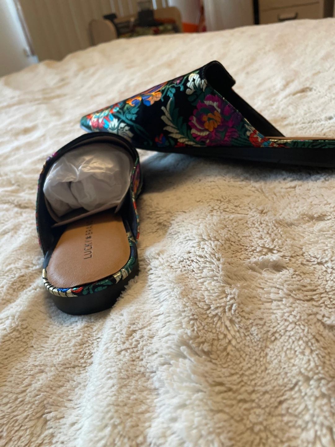 These are a pair of Lucky Brand mules women shoes in a size 9M. They feature a beautiful floral print on a black background. They are brand new never been used great condition and ready for a new home was a gift didn’t like the style too fancy cash only please no e-transfers thank you